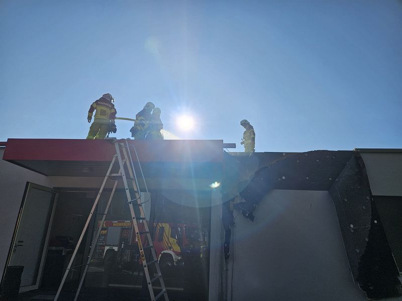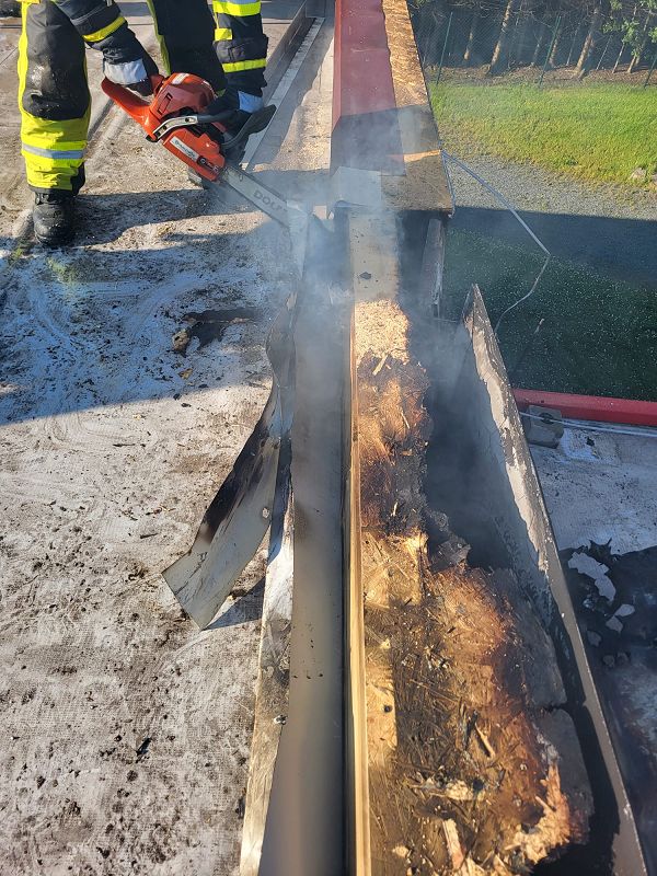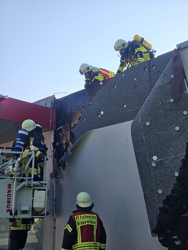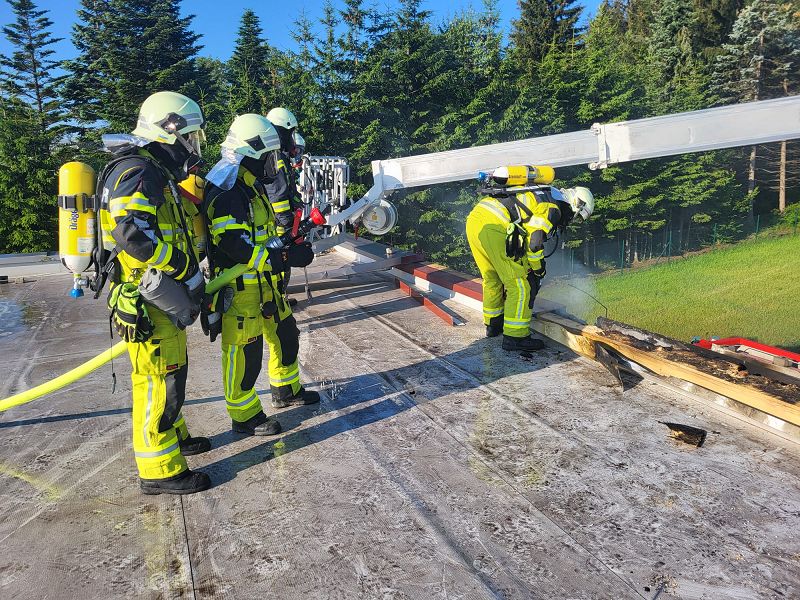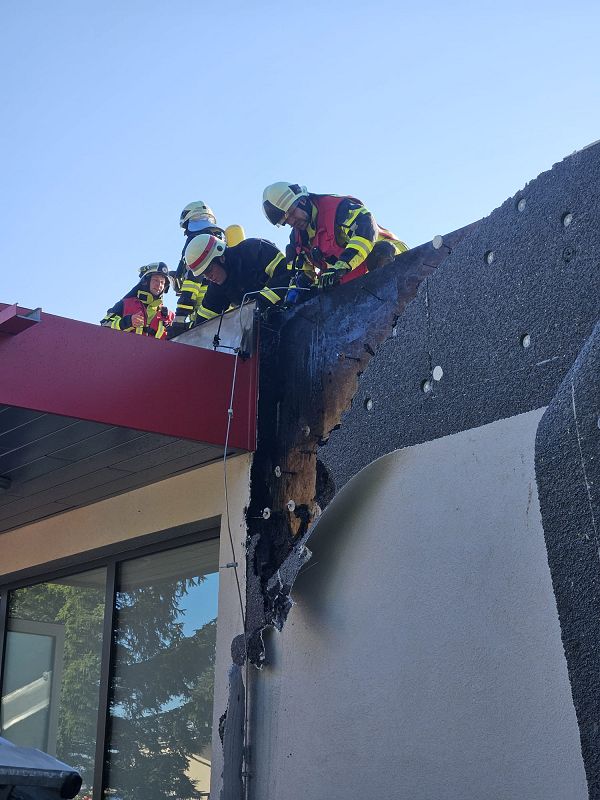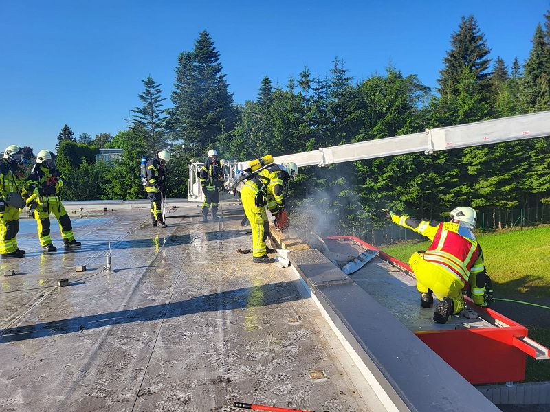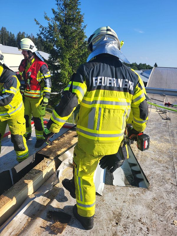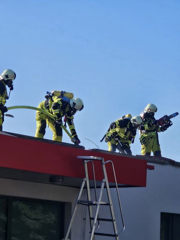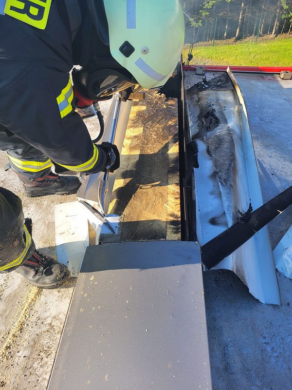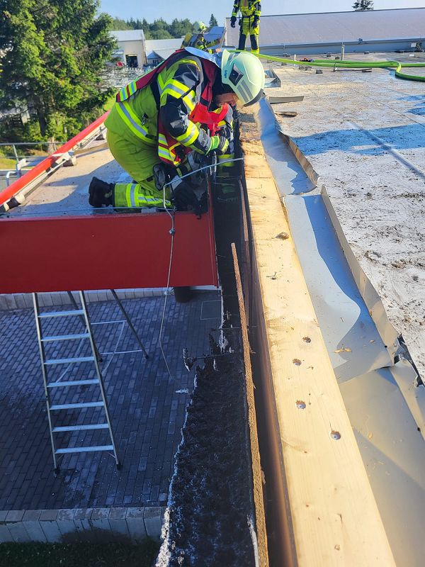 Nach einer kurzen Lageerkundung im Inneren des Gebäudes mittels Wärmebildkamera zur Suche des eigentlichen Brandherdes wurde schnell das unmittelbare Dach als Brandherd ausgemacht. Nachdem das Gebäude stromlosgeschalten wurde und auch alle Mitarbeiter im Außenbereich in Sicherheit waren, begaben sich die Einsatzkräfte auf das Dach und öffneten mittels Rettungssägen (* siehe Hinweis) die verblechte Attika. Mit immer nur kurzen Wasserstößen aus den Hohlstrahlrohren konnte das schwelende Feuer schnell unter Kontrolle gebracht werden. Auch die in die Wärmedämmfassade eindringende Glut wurde durch eine Öffnung der Fassade schnell gelöscht.