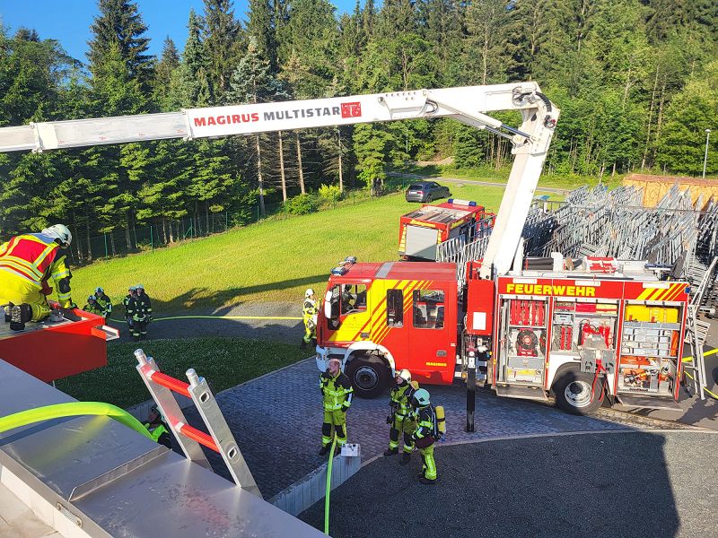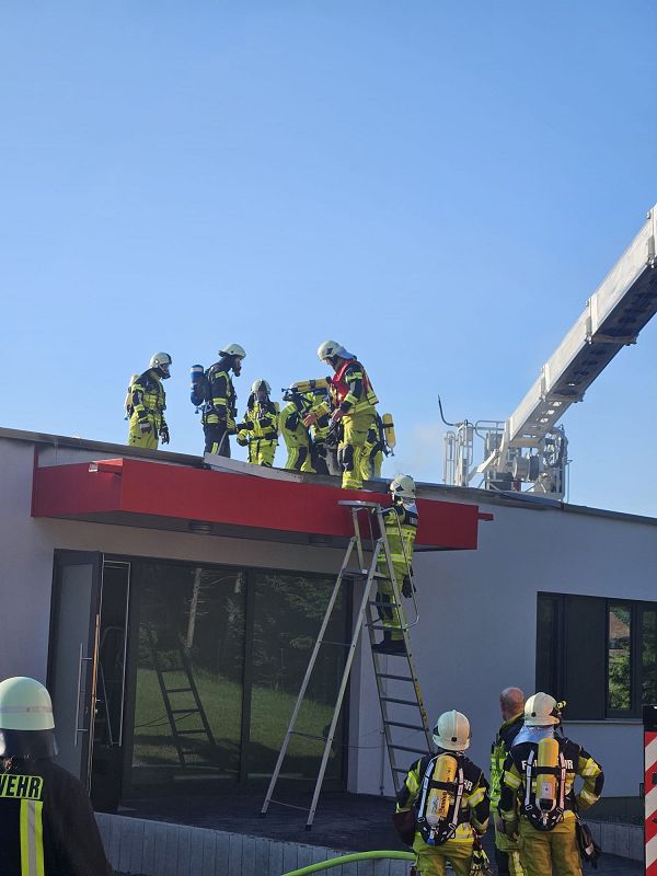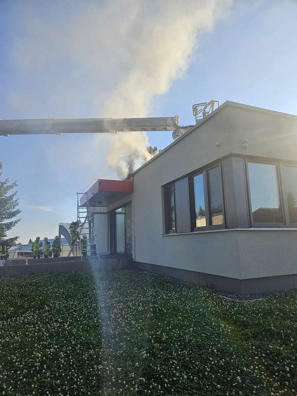 Die Einsatzkräfte der Feuerwehr Grünbach und Muldenberg wurden zur Fensterbaufirma an die Falkensteiner Straße gerufen und nahmen zunächst einen eventuellen Fehlalarm an. Dem war aber leider nicht so, denn dichter Rauch drang im Dachbereich des, erst neu errichteten, Bürogebäude aus der Attikaverkleidung.