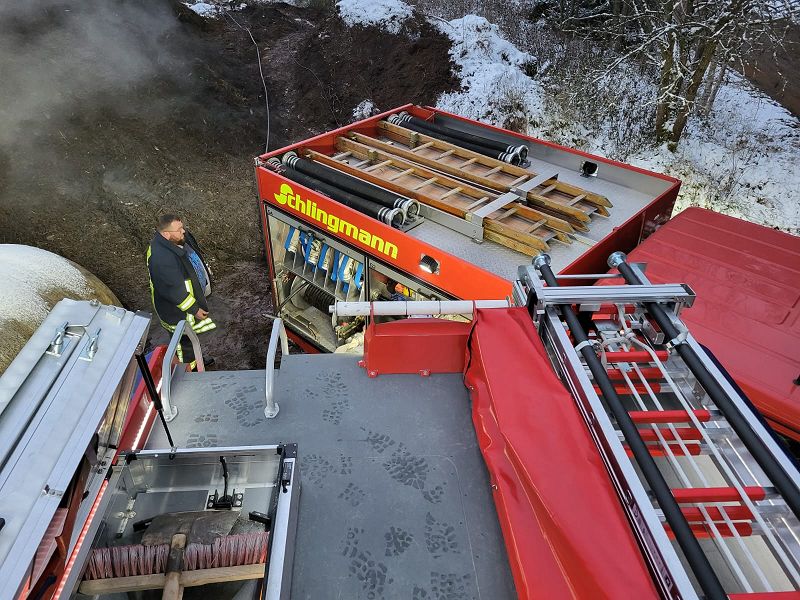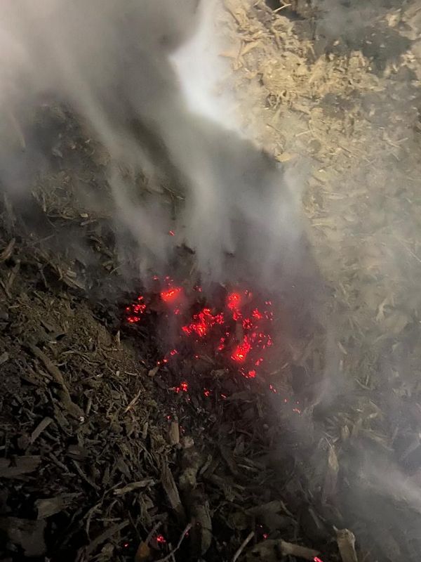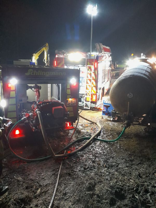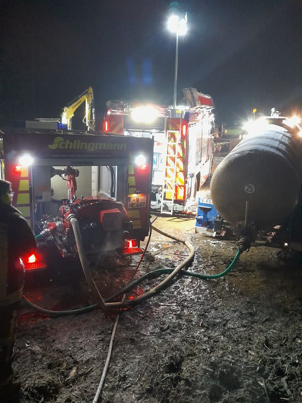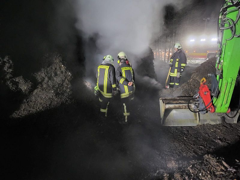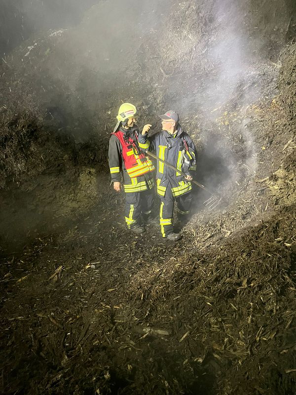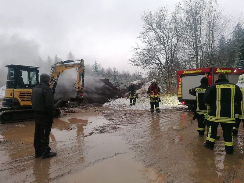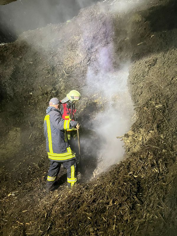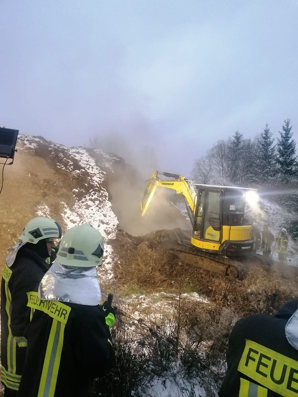 Bei Eintreffen der Feuerwehr war bereits der Eigentümer mit Baggern im Einsatz um den ca. 400m³ großen Haufen Schreddermaterial (Wurzeln, Gehölz, etc) zu trennen. Mit Hilfe der Feuerwehr wurden die aufgedeckten Glutnester abgelöscht. Nach Einschätzung der Einsatzleitung wurde der Einsatz am Abend zunächst für beendet erklärt. Mit Hilfe der Wärmebildkamera wurde der Haufen kontrolliert. Da kein Wasser vor Ort war, wurde mit Hilfe eines ansässigen Bauers 10.000l Wasser im Fasshänger geholt, der Rest wurde mittels Pendelverkehr des HLFs bereitgestellt. Im Verlauf des Einsatzes wurden ca 26.000l Wasser aus 2 C-Rohren eingesetzt.