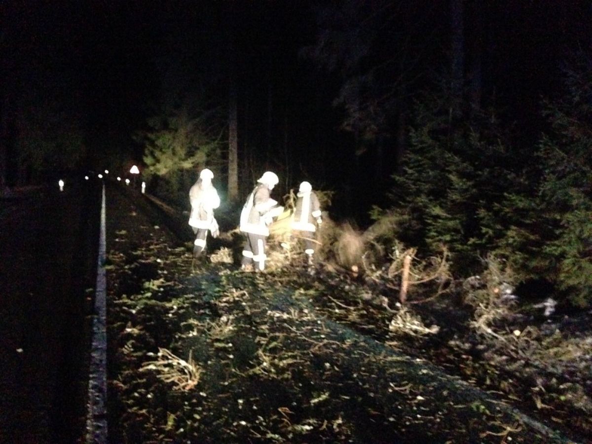 Wir wurden zu einem umgestürzten Bäumen auf der Ortsverbindung Grünbach-Muldenberg alarmiert. Während das HLF mittig zwischen den Ortsteilen auf der Straße einen umgestürzten Baum von der Straße entfernte, kümmerte sich die Besatzung des MTW um einen weiteren Baum in der Nähe des Bahnhofes Muldenberg. Beide Bäume waren bereits morsch und konnten den Orkanböen des Sturmtiefs "Thomas" dadurch nicht mehr standhalten.