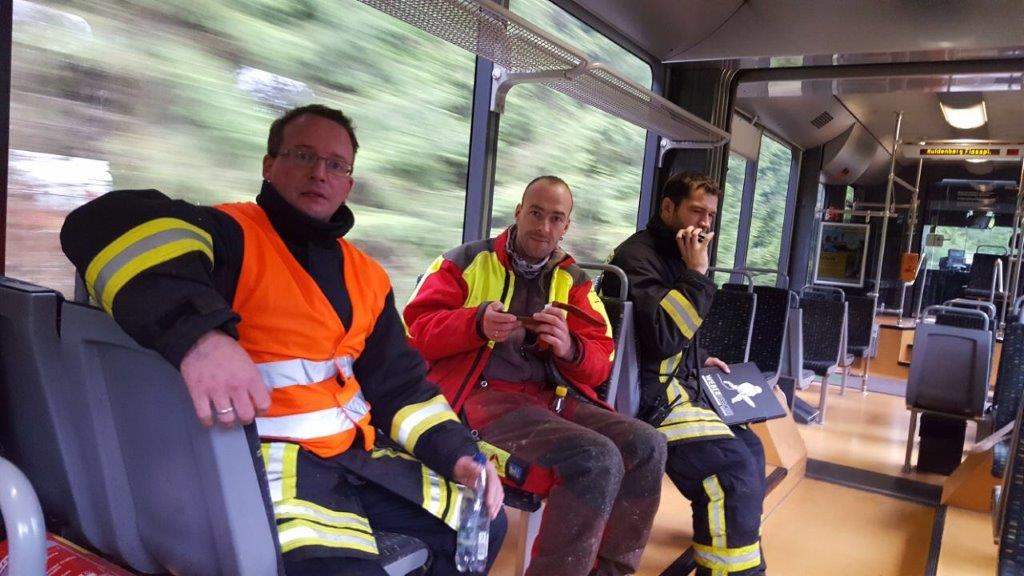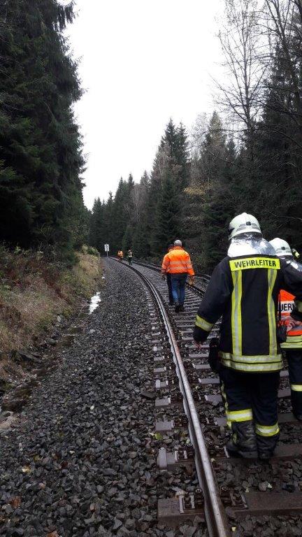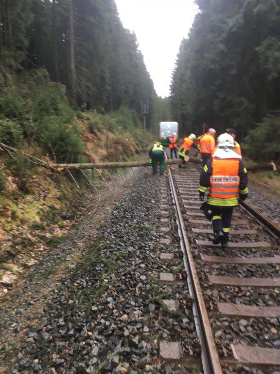 Durch die Bahn wurde die FF Grünbach herangezogen um umgestürzte Bäume auf der Bahnlinie zu beseitigen. Bis Bahnkilometer 5,0 von Falkenstein kommend beseitigte die FF Falkenstein umgestürzte Bäume. Danach bleib wieder ein Triebwagen mit Passagieren kurz vor Grünbach stecken. Wir machten uns zu Fuss vom Haltepunkt Grünbach aus auf den Weg zum Triebwagen und beseitigten den Baum. Danach fuhren wir mit dem Triebfahrzeug bis zum Haltepunkt Muldenberg und beseitigten auf der Strecke weitere 3 Bäume. In Muldenberg übernahm die FF Muldenberg und wir kehrten nach einem langen Einsatz-Tag wieder zum Gerätehaus zurück. Nach einem Kaffee konnte das Equipment gereinigt und wieder fit gemacht werden, und die Einsatzkräfte konnten das Gerätehaus verlassen.