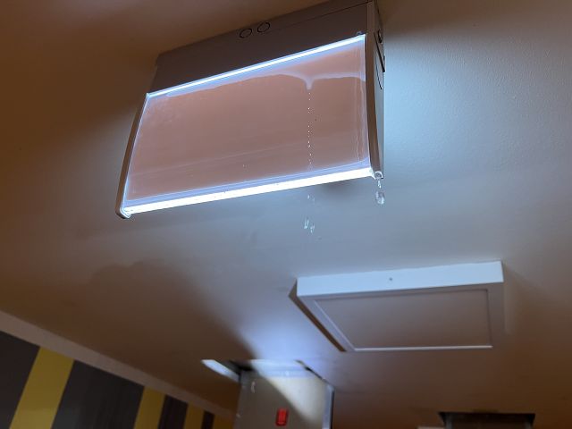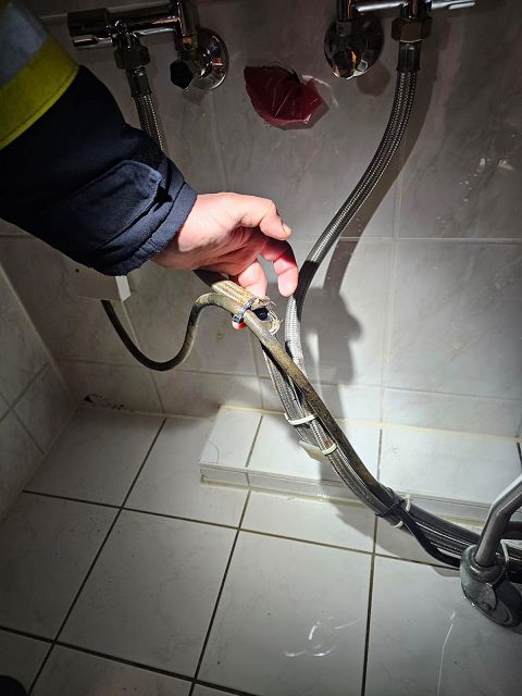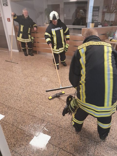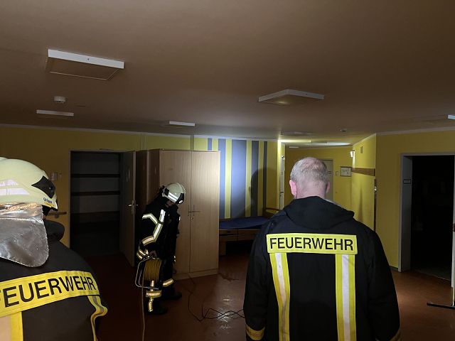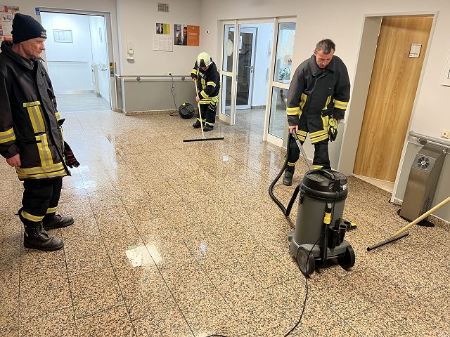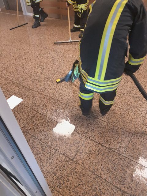 Und trotzdem war das schnelle Eingreifen der Grünbacher Feuerwehrkameraden von ungehörter Wichtigkeit. Das Gebäude stand unter Wasser. Schuld war ein geplatzter Anschlußschlauch eines Reinigungsgerätes im Erdgeschoss. Das heftig austretende Wasser verteilte sich über die Geschoßdecke. Über den angrenzenden Versorgungsschacht konnte das Wasser in das Kellergeschoß gelangen und verteilte sich dort über die Trockenbaudecken auch bis zu den Rauchmeldern. Diese meldeten die ursächliche Störung.