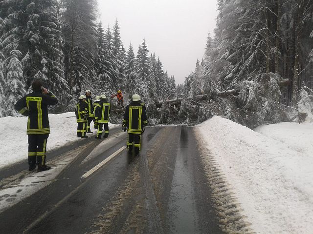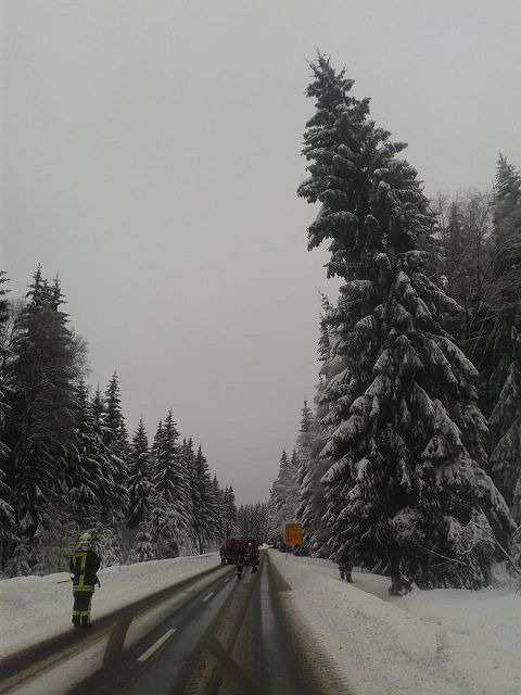 Auf der Staatstraße von Hammerbrücke nach Muldenberg droht eine Fichte auf die Straße zu stützen. Noch ehe das passieren sollte, wurden die Kameraden alarmiert, schlimmeres zu verhindern. Der Baum wurde gefällt und durch kraftvolle Unterstützung aus der Nachbarschaft mit einem Traktor beiseite geschoben. Nun können alle wieder sicher durch die verschneite Winterlandschaft fahren.