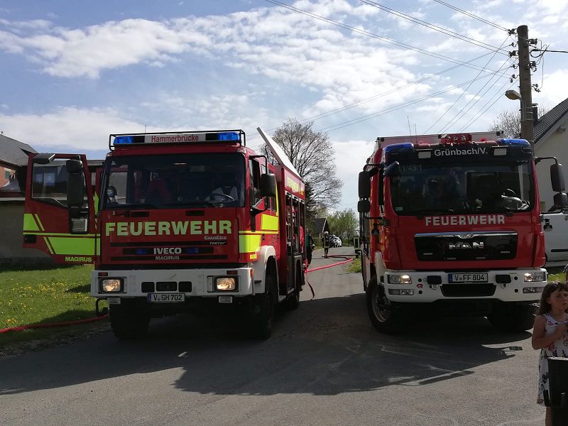 Da der Schuppen in Vollbrand stand und sich das Einfamilienhaus eng daneben in höchster Gefahr befand, war Eile geboten. Deshalb wurde nach der Alarmierung sofort die Alarmstufe Mittelbrand ausgelöst. In dieser Alarmierungsgruppe ist auch Grünbach integriert und umgekehrt Hammerbrücke, wenn es in Grünbach brennt.