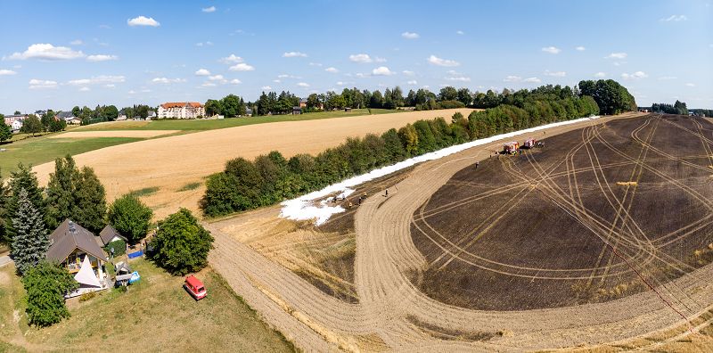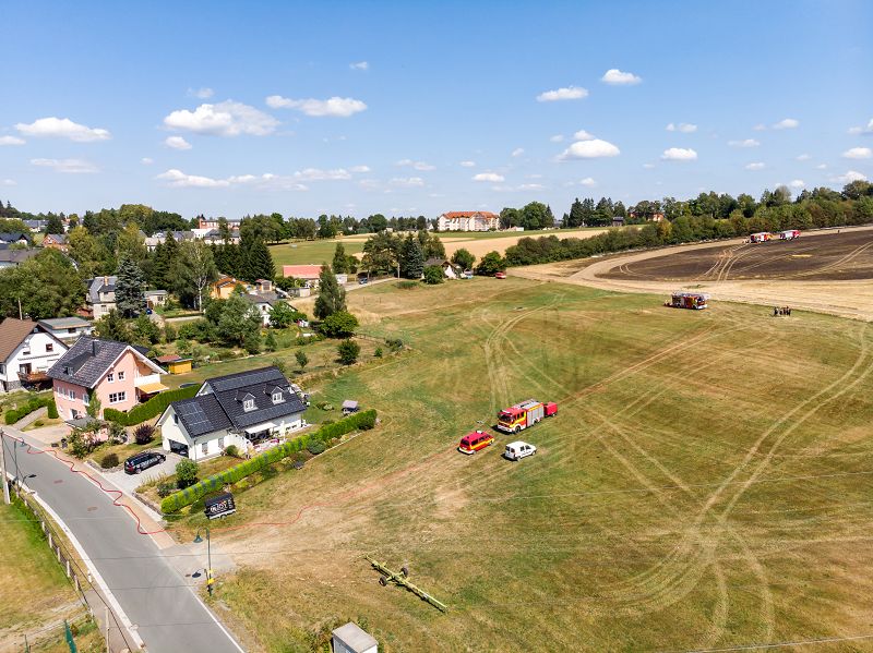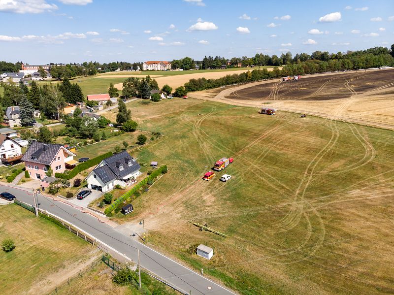Feldbrand auf einem Getreidefeld hinter den beiden Sportplätzen. Vermutlich ausgelöst durch einen Mähdrescher kam es zum Entzünden des Strohfeldes. Die Brandwalze breitete sich rasend schnell in Richtung Siehdichfürer Straße und dem dort am Rand stehenden Einfamilienhaus aus. Aber auch in der gegenrichtung zur Muldenberger Straße bewegte sich die Feuerwalze. Mit der Grünbacher Wehr allein, wäre dieser Einsatz nicht zu schaffen gewesen!