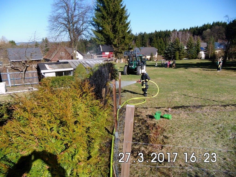 Durch Unachtsamkeit geriet einem Grünbacher Bürger eine Hecke in Brand und breitete sich in Sekundenschnelle aus. Nur durch das besonnene sofortige Eingreifen der Anwohner mit Gartenschlauch und mehreren Pulverlöscher konnte der Heckenbrand bis zum Eintreffen der Rettungskräfte in Schach gehalten werden. Die 2000 Liter Löschwasser des HLF 20 reichten somit aus, die restlichen Flammen abzulöschen.
