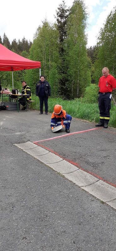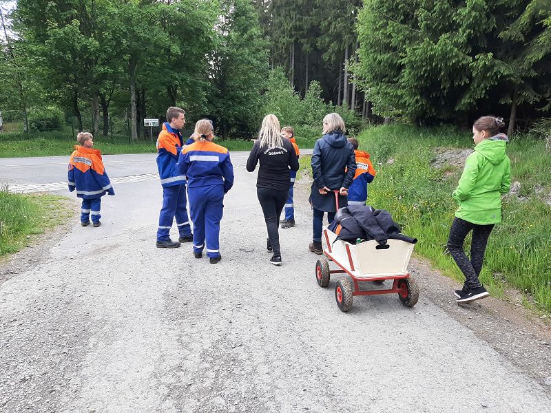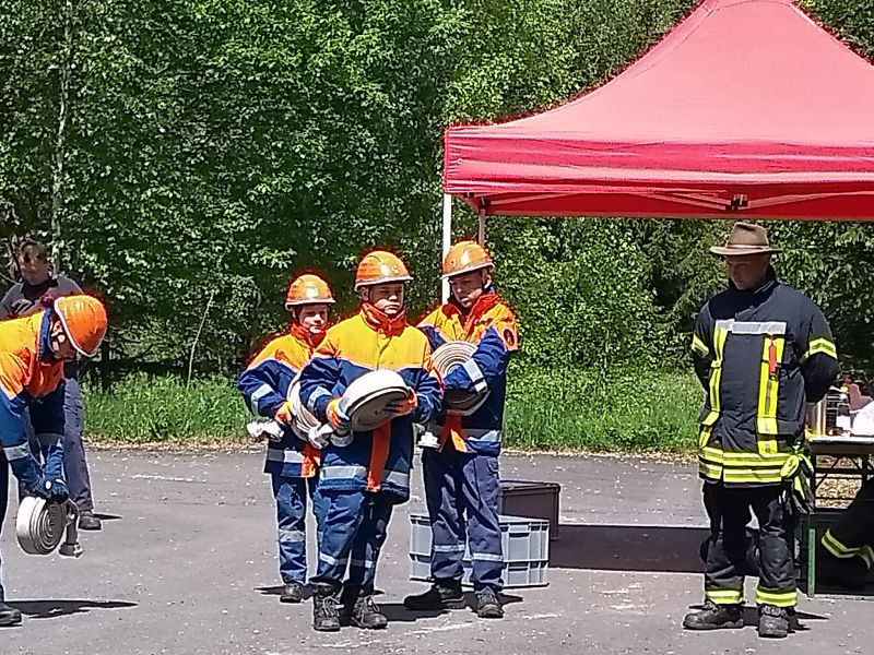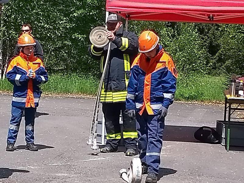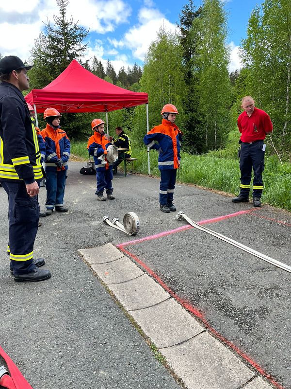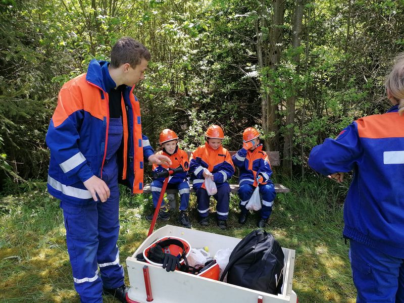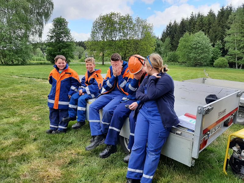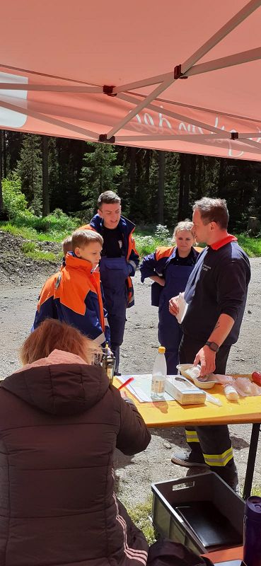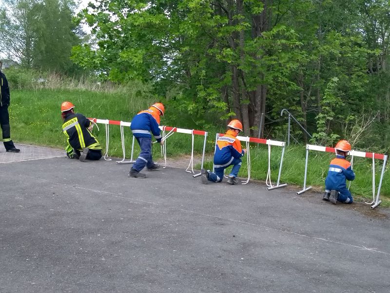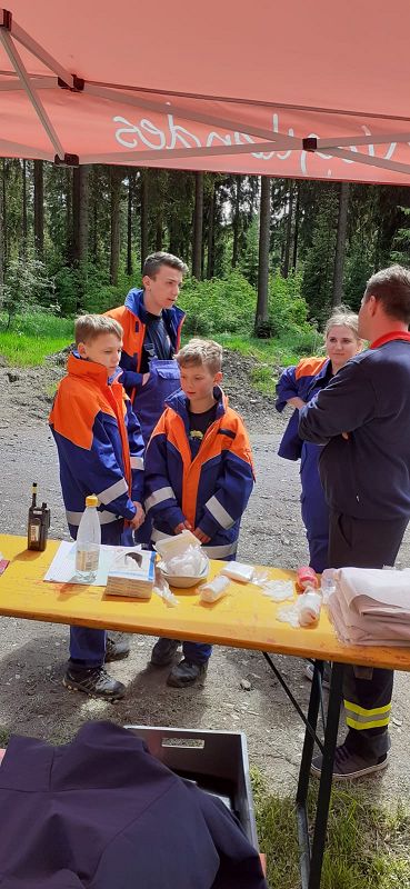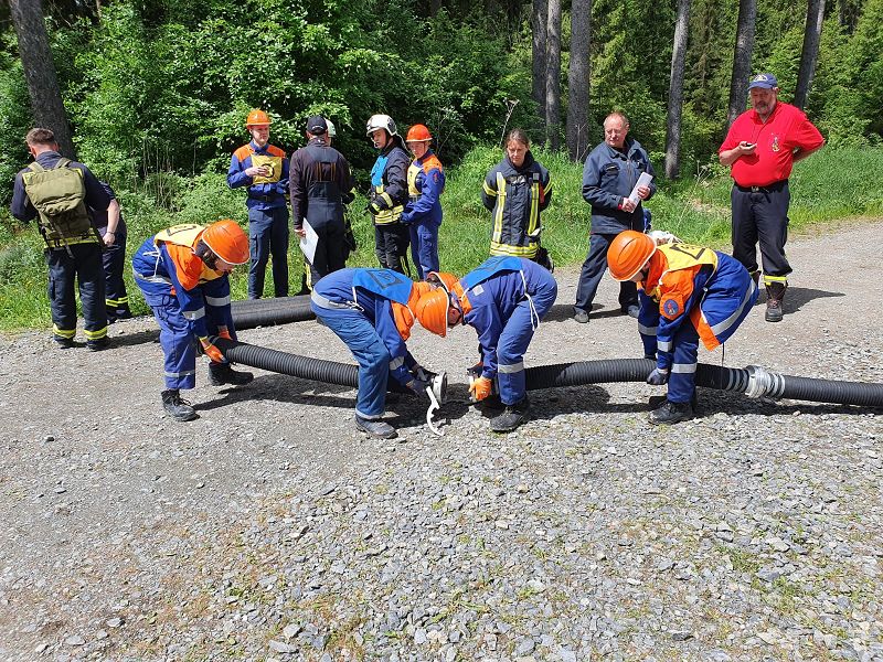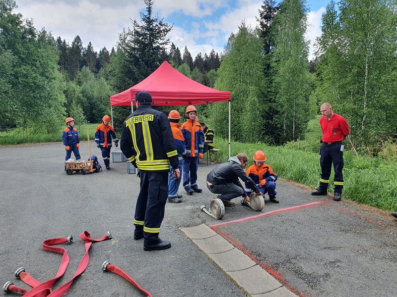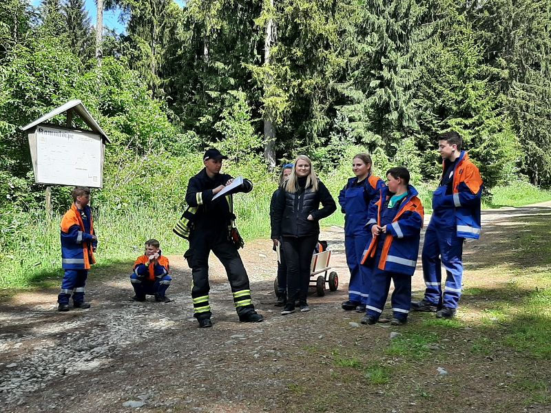 Auf der Strecke verteilt, mussten verschiedene Stationen absolviert werden. C-Schlauch ausrollen, Erste Hilfe Maßnahmen, Knoten und vieles weitere Feuerwehrfachwissen wurde abgefragt. Insgesamt waren es 8 Stationen die gemeistert werden mussten. Nach ca. 4h erreichten alle Mannschaften geschafft, aber fröhlich, das Ziel am Badeteich in Muldenberg, an dem sie auch gestartet waren.