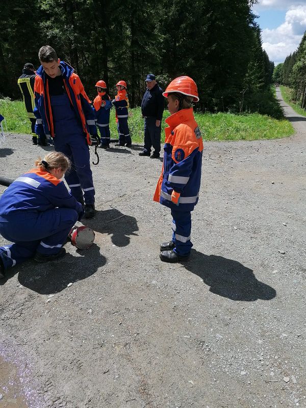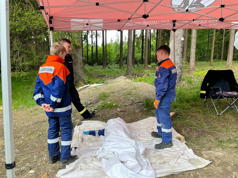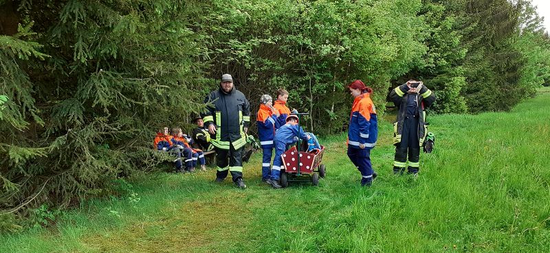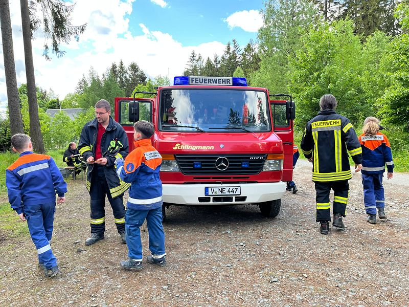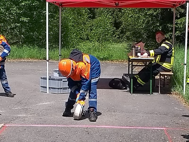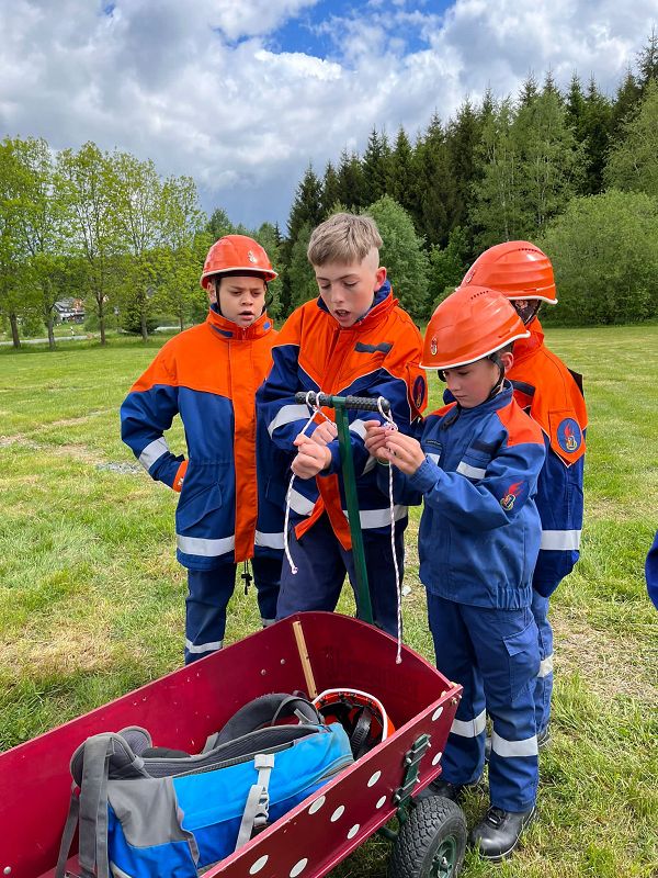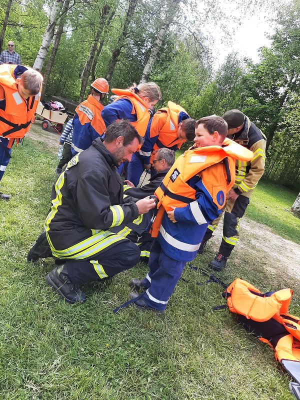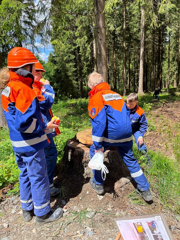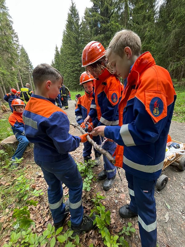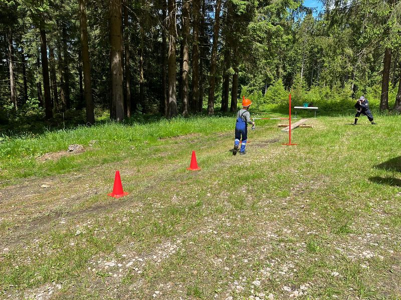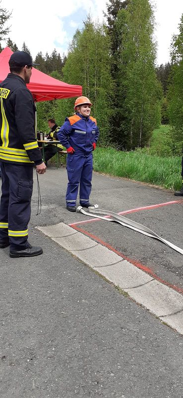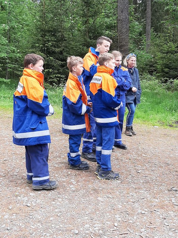 Auf der Strecke verteilt, mussten verschiedene Stationen absolviert werden. C-Schlauch ausrollen, Erste Hilfe Maßnahmen, Knoten und vieles weitere Feuerwehrfachwissen wurde abgefragt. Insgesamt waren es 8 Stationen die gemeistert werden mussten. Nach ca. 4h erreichten alle Mannschaften geschafft, aber fröhlich, das Ziel am Badeteich in Muldenberg, an dem sie auch gestartet waren.