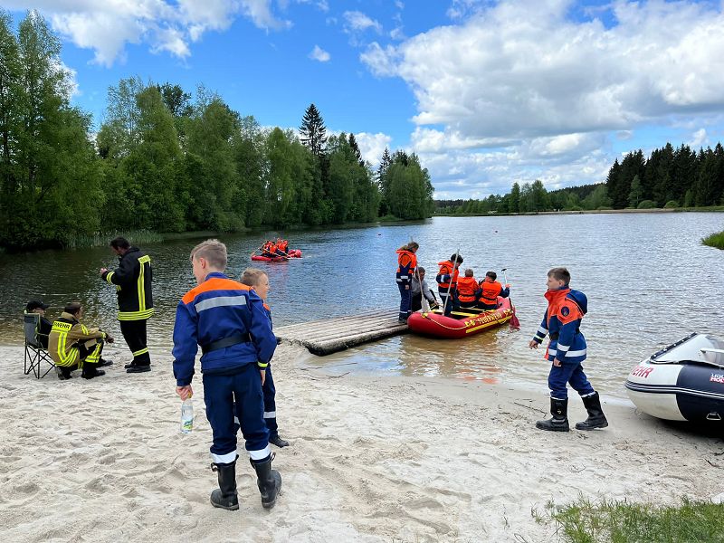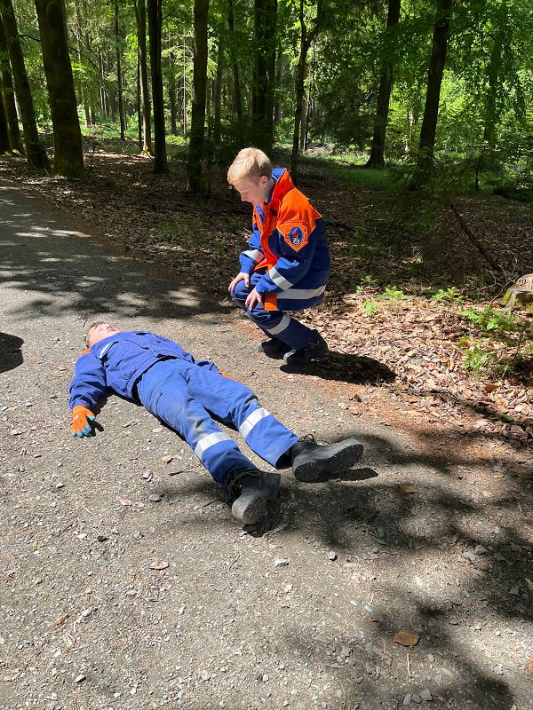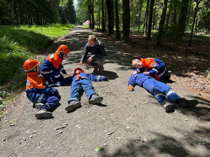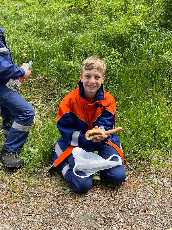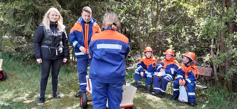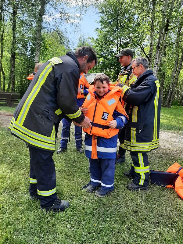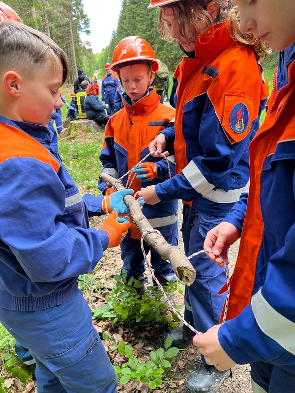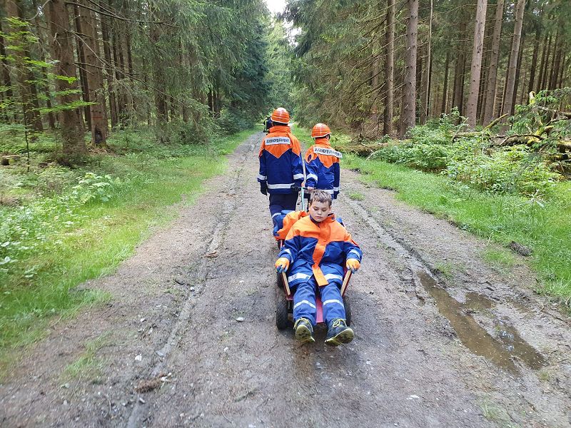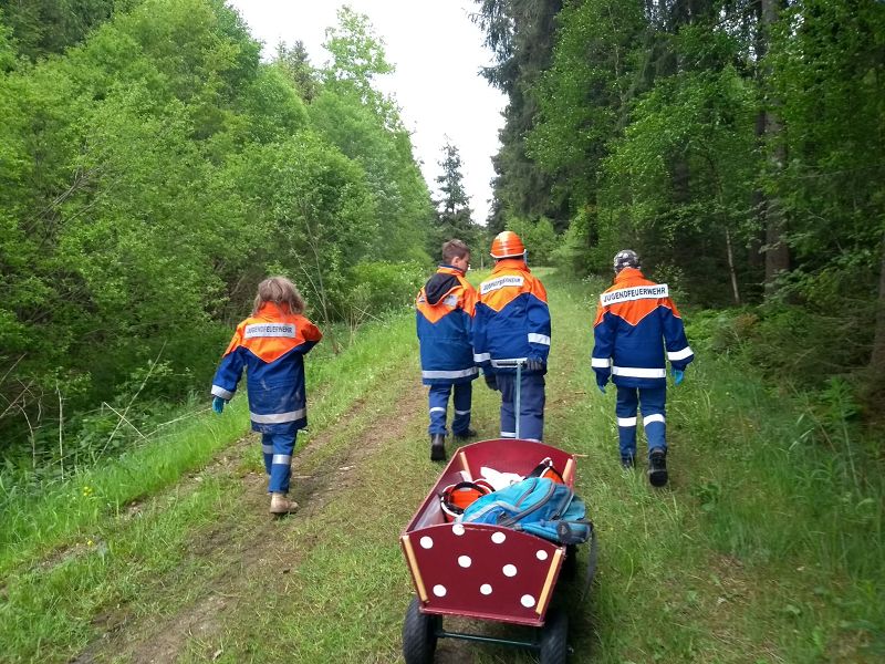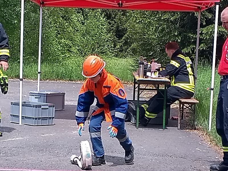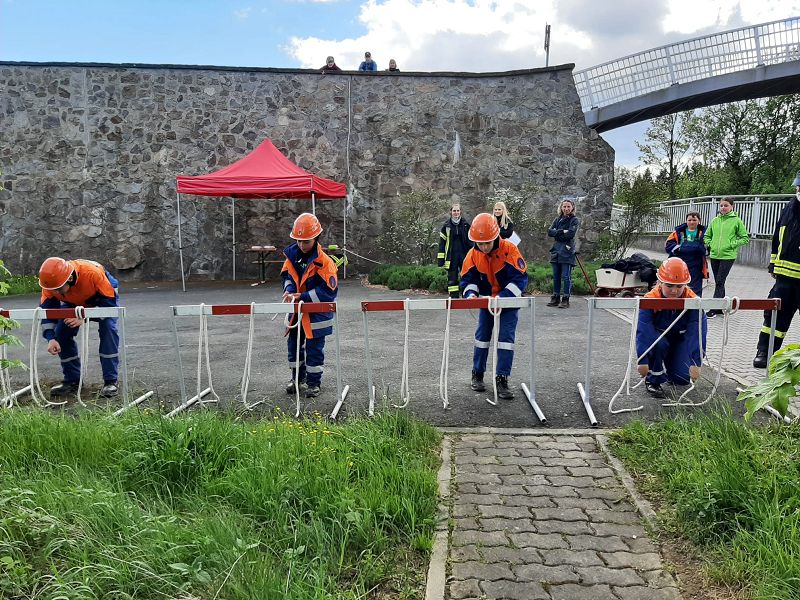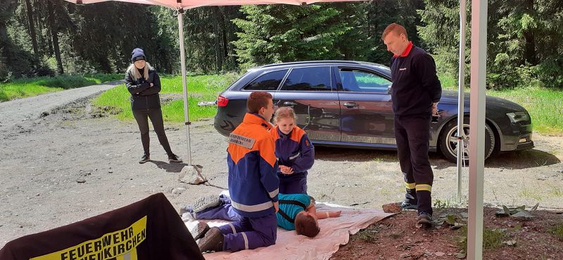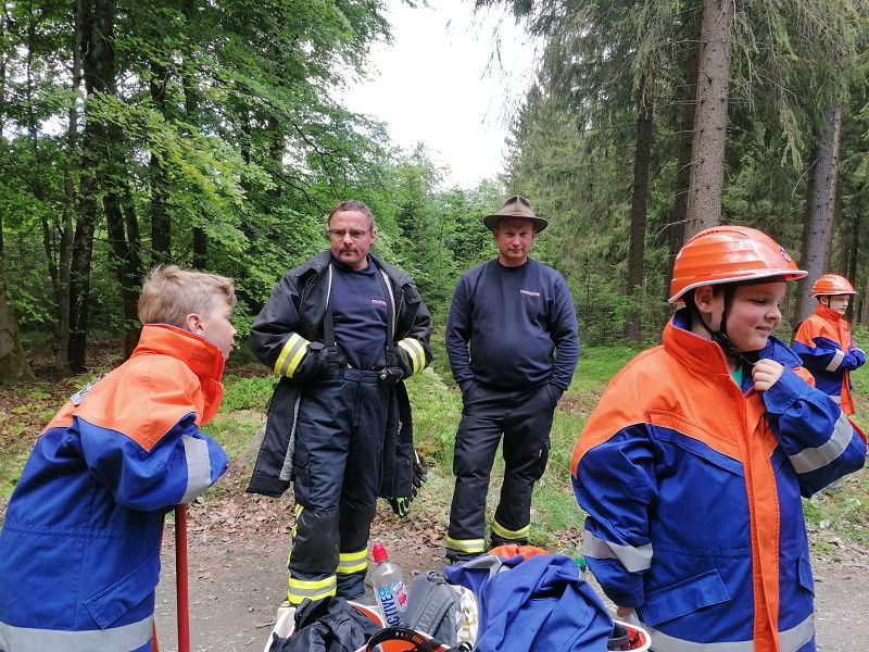 Auf der Strecke verteilt, mussten verschiedene Stationen absolviert werden. C-Schlauch ausrollen, Erste Hilfe Maßnahmen, Knoten und vieles weitere Feuerwehrfachwissen wurde abgefragt. Insgesamt waren es 8 Stationen die gemeistert werden mussten. Nach ca. 4h erreichten alle Mannschaften geschafft, aber fröhlich, das Ziel am Badeteich in Muldenberg, an dem sie auch gestartet waren.