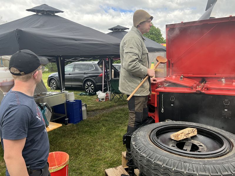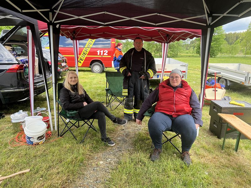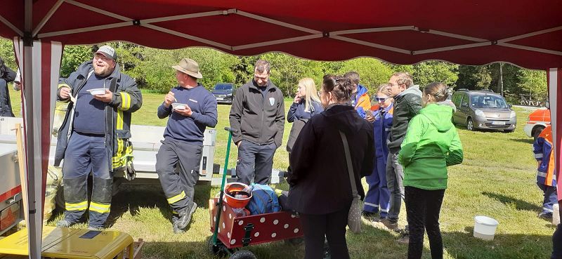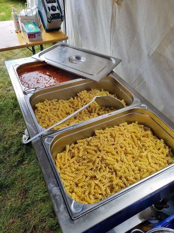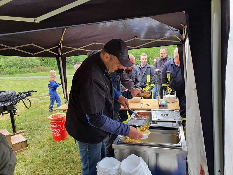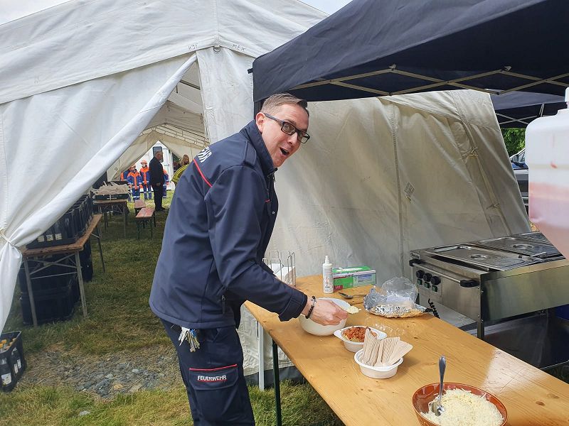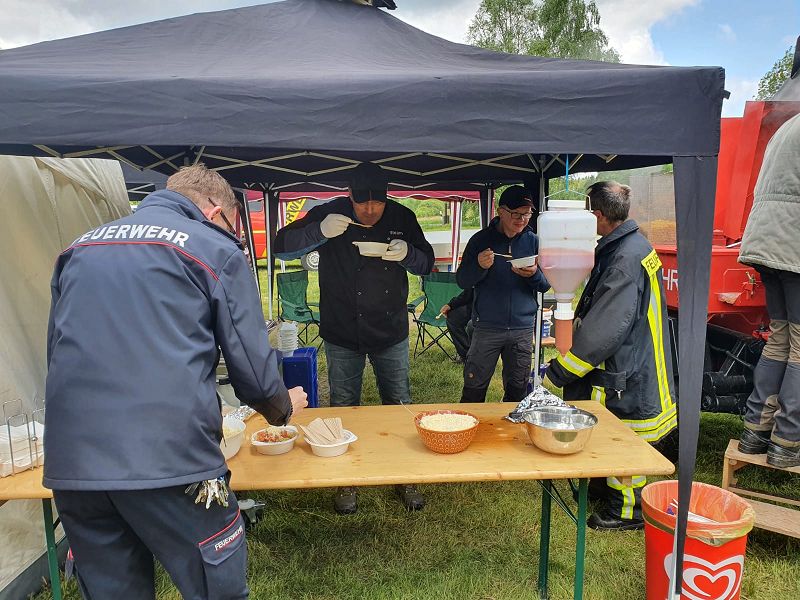Für das ortseigene Küchteam - es gab Nudeln mit Wurst und Tomatensoße - war es kurz vor Schluß doch nochmal "Heiß" geworden. Das Essen drohte nicht für alle Teilnehmer zu reichen, denn durch Nachmeldungen waren am Ende mehr als 400 Portionen Essen zubereiten worden! Improvisation war angesagt, genau das können doch die Feuerwehrleute perfekt!