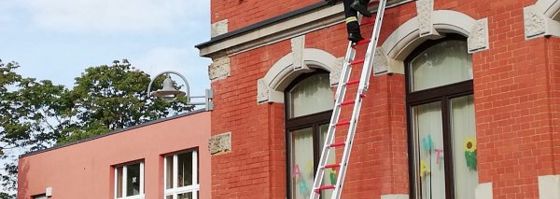 Grünbacher Feuerwehr schnuppert Höhenluft auf den Dächern der Grünbacher Grundschule