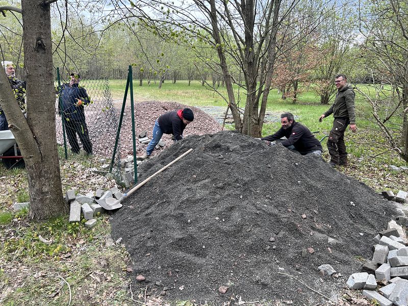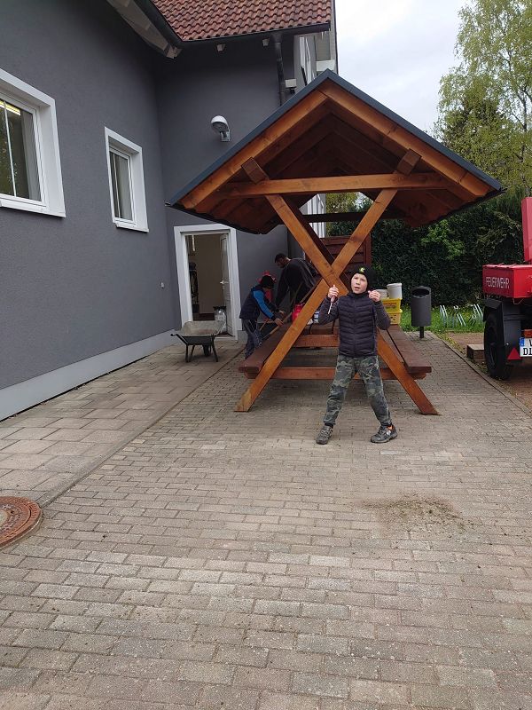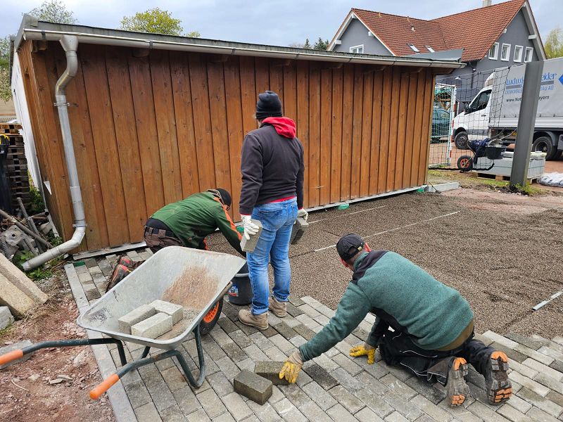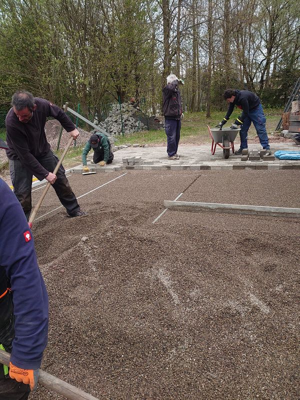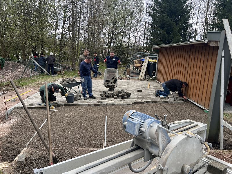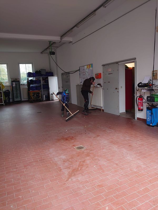 Sie wischten die Fahrzeughalle und hatte dabei noch richtig Spaß, wie die Bilder zeigen! Danke euch allen! Während dessen hatten die Kameradinnen und Kameraden genügend Zeit die Pflasterfläche hinter den Garagen fertig zu stellen. Sie dient in Zukunft der Aufstellung unserer mobilen Verkaufshütten. Von nun an stehen sie nicht mehr im feuchten Boden, sondern auf einer trockenen Pflasterfläche und halten damit bedeutend länger.