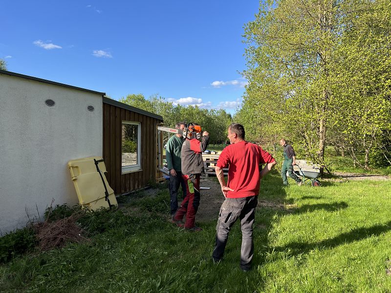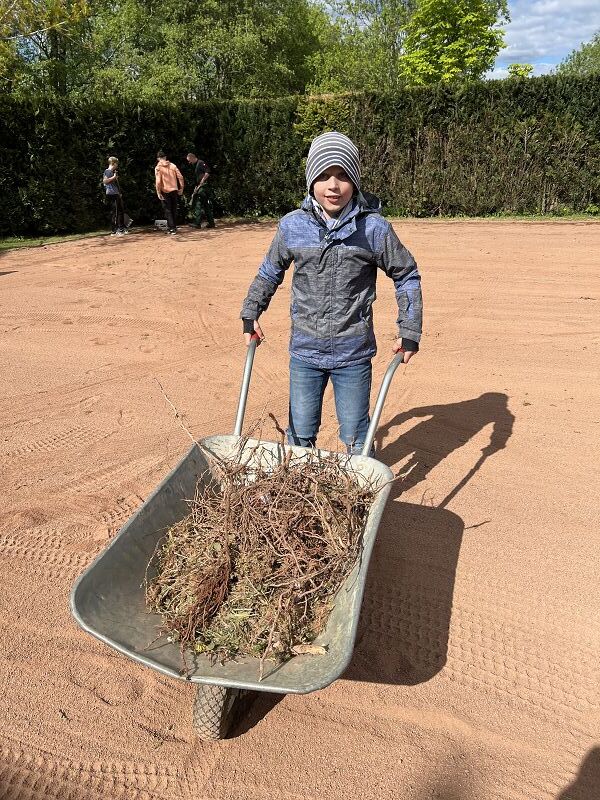 Im Außengelände wuselte es wie im Bienenschwarm! Kameraden reinigten die beiden Einsatzfahrzeuge insbesondere von Innen. Alle Hecken- und Pflanz- und Pflasterbereiche wurden grundhaft vom Fremdbewuchs und vom Unkraut befreit. Dort konnte man auch mal sehen, was unsere Mädels und Jungs der Jugendfeuerwehr so zu leisten im Stande sind. Bei sehr viel Spaß und guter Laune, waren auch Sie beim Unkraut herauskratzen und beim Schubkarrenwettlauf voll dabei! Auf dem Park- und Volleyballplatz stand die Jahrespflege des Ziegelmehlbelages an. Dafür dürfen wir immer das Pflegegerät der Gemeinde Ellefeld nutzen! Das ist große Klasse und locker einen Kasten Bier wert! Um auch in Zukunft unsere Gulaschkanone unter Volldampf stellen zu können, wurde von einigen Kameraden Brennholz geschnitten und gespalten und gleich in die neuen Regale verstaut!