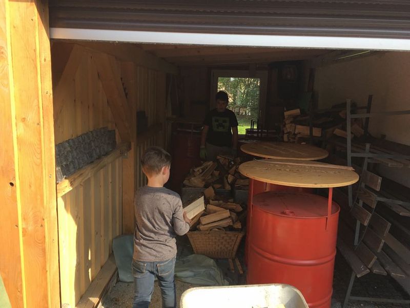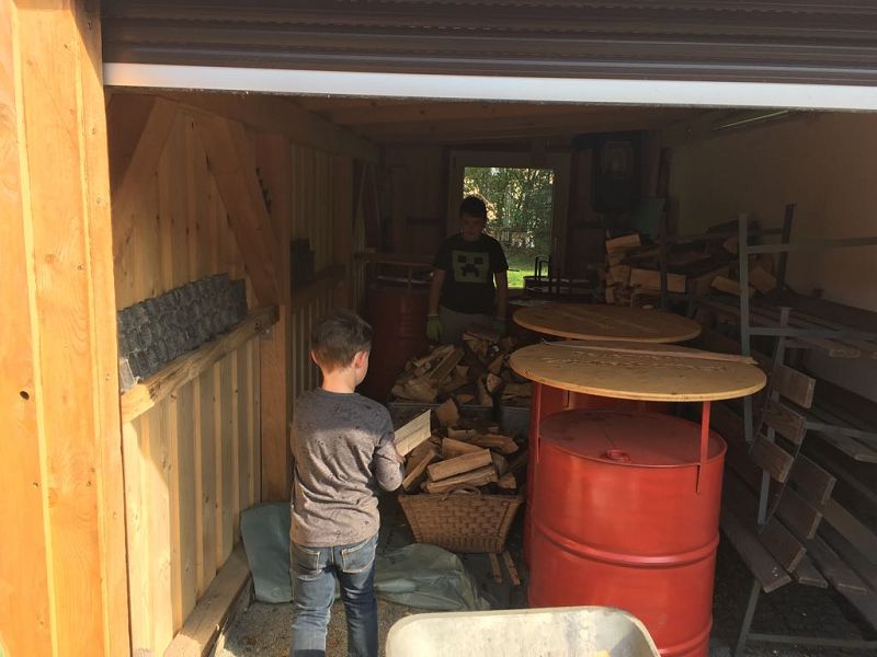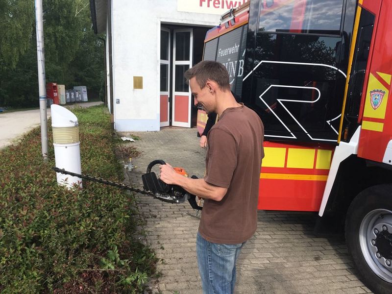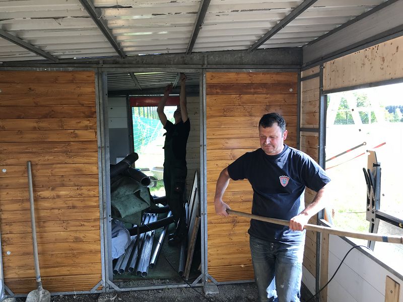 Das restliche Brennholz für die Feldküche wurde gespalten und von Jugendfeuerwehrleuten aufgeschlichtet. Die Sitzbänke am Pausenbereich wurden fertig gestellt und auch die Grünanlagen mit Hecken und Parkflächen bearbeitet! Das Schaukel- und Klettergerüst erhielt neuen Fallsand und die Garagentore wurden gereinigt.