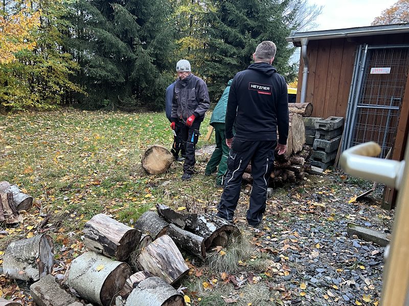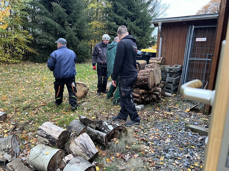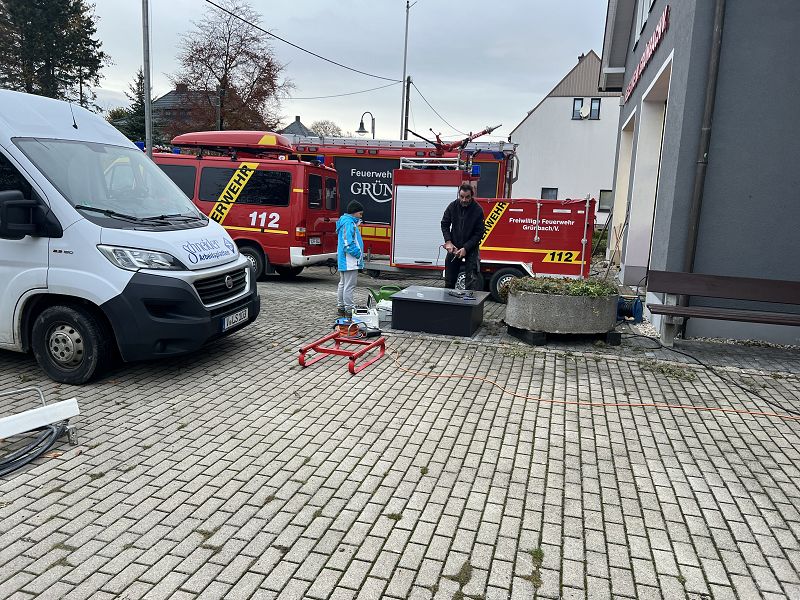 So wurde das Laub gesammelt und alle Hecken einem Herbstschnitt unterzogen. Eine Truppe sägte und spaltete Brennholz für den Einsatz der Feldküche und ein weiterer Trupp reinigte die Straßenentwässerungsrinne vor dem Grundstück des Feuerwehrhauses, da diese Rinne völlig mit Schmutz und Laub gefüllt war. Eigentlich auf einer Staatsstraße (S 304) nicht die Aufgabe der Feuerwehr. Doch damit schützen wir unser eigenes Gebäude und somit machen wir es dann im Notfall doch! Eine weitere Truppe bereite unser Podest für die Aufstellung einer historischen Tragkraftspritze vor. Diese soll dann im Frühjahr zur Zierde neugierige Blicke der Besucher von Grünbach auf sich ziehen. Über die kommende Feiertage steht dort unser Drehturm, der bald wieder angeschoben werden muß! Schon jetzt können alle ihre Kräfte sammeln, damit er dann schön drehen kann.