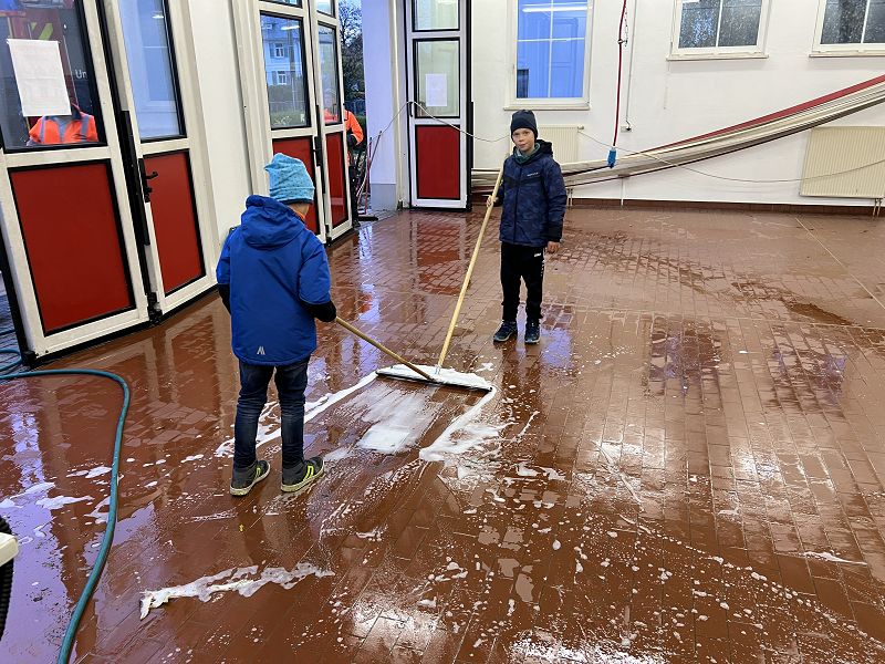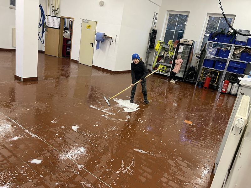 Die Fahrzeugpflege und die Reinigung der Einsatzräume mit Umkleide, Stiefelwäsche und Werkstatt gehören zu den Standardarbeiten. Die Pflege des Außengeländes ebenso.