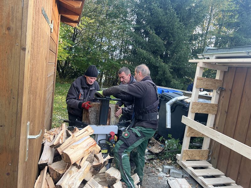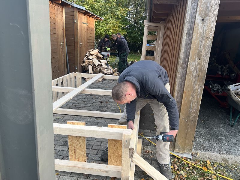 Und doch wurde ne Menge weggearbeitet. Der Schwerpunkt lag dieses Mal in der Außengestaltung und bei den Holzarbeiten. Die in diesem Jahr umfassenden Kocheinsätze mit der Feldküche zehrten an den Holzvorräten. Und so machten sich die Kameraden mit ihren Kettensägen und Holzspaltern auf zum Feuerwehrhaus. Gesägt und gespalten fand das neue Brennholz gleich seinen neuen Lageplatz, im nagelneu- gebauten Holzregal.