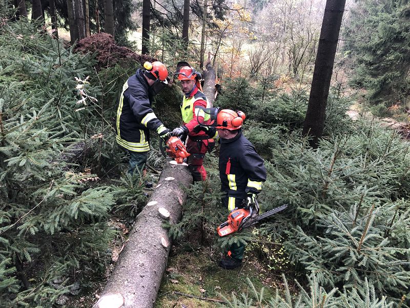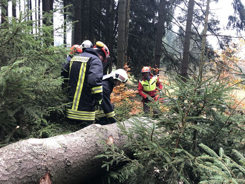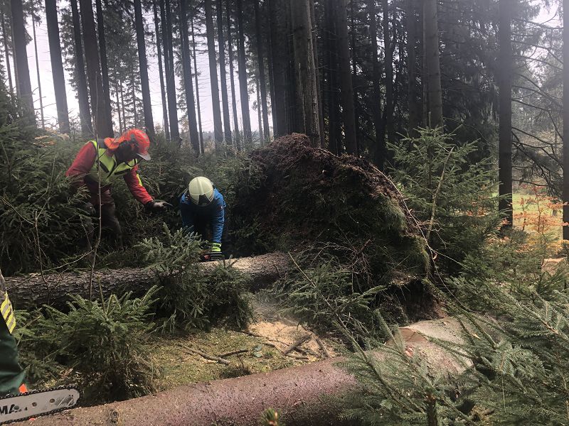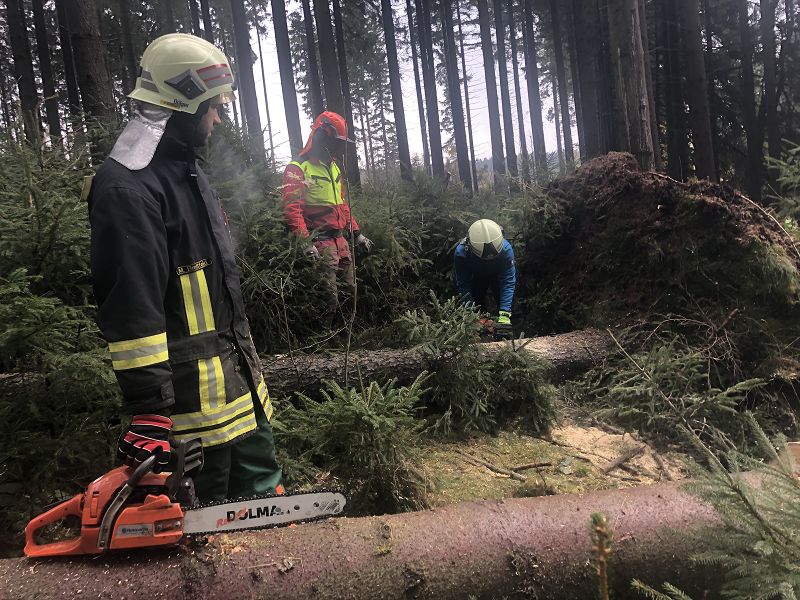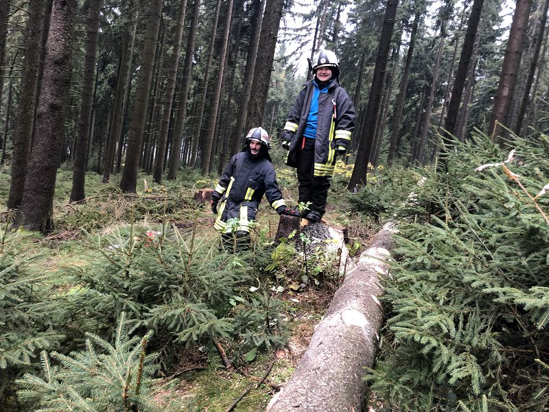 Wie für uns bestellt, hatte dieses Waldstück alles zu bieten, was einen Sturmschaden - Waldstück gerecht wird. Entwurzelte Bäume, liegende Bäume mit Biegespannung, schräng hängende Bäume u.v.m. Auf Grund der geringen Beteiligung, konnten alle Kameradinnen und Kameraden ausführlich den Umgang mit der Säge wieder einmal proben.