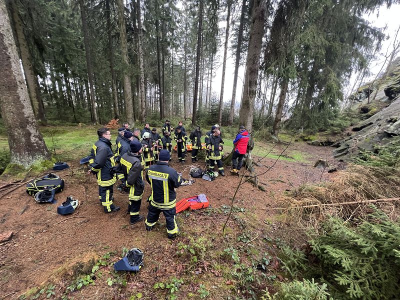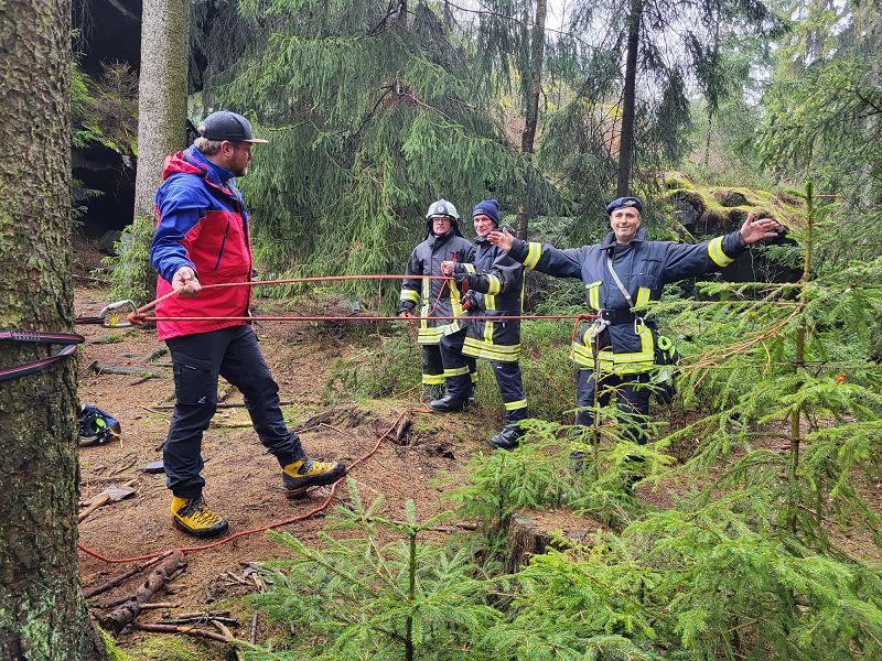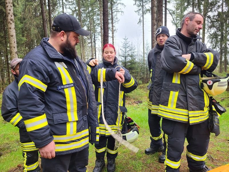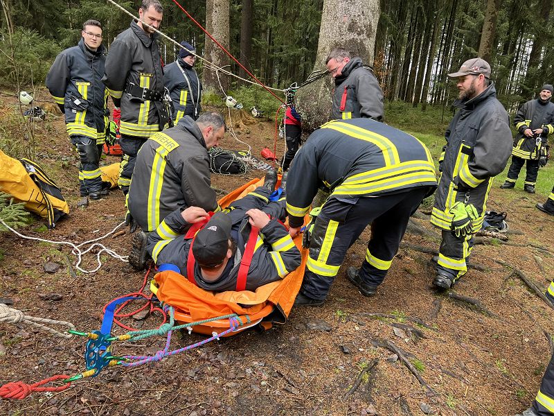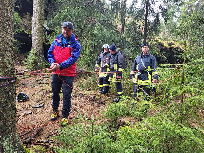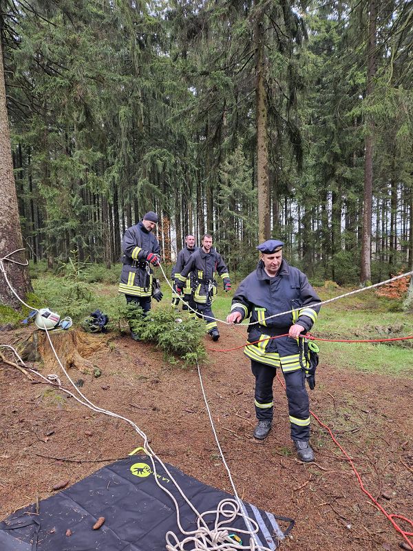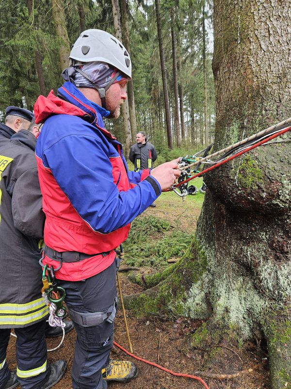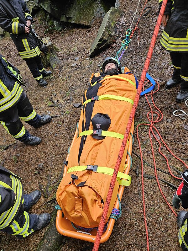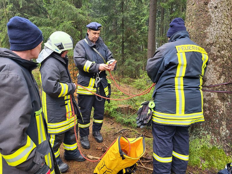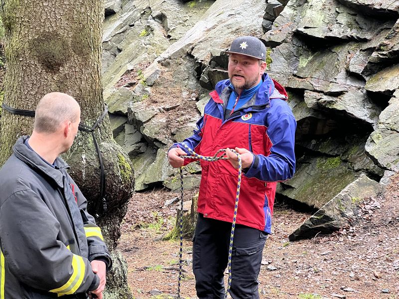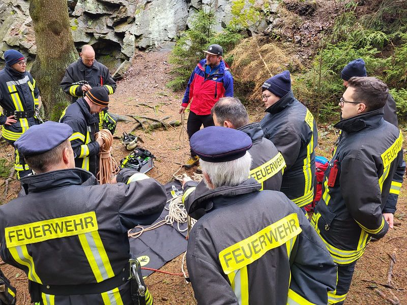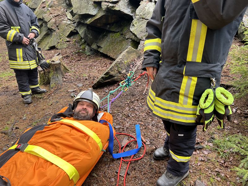 Diesmal hatte die Wehrleitung professionelle Unterstützung zur Ausbildung von der Bergwacht Klingenthal eingeladen. Simon Eßbach ist sächsischer Ausbilder des Bergwachtnachwuchses und hatte den Grünbacher Einsatzkräfte eine Menge Wissenswertes zu vermitteln. Zunächst wurden die wichtigsten Knoten, wie Achterknoten, Mast- und Halbmastwurf gelehrt und aufgefrischt. Da merkten die Meisten schon, dass es super wichtig ist, all das mal wieder zu üben. Dann wurden Rettungsszenarien zur Selbstrettung und zur Rettung von Verletzten mit der Schleiftrage geprobt. Gepaart mit viel Wissensvermittlung zur Gerätenutzung zu den Seile und den verschiedensten Karabiner, sowie Seilschlingen.