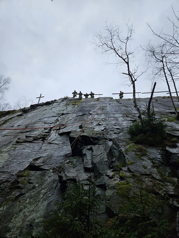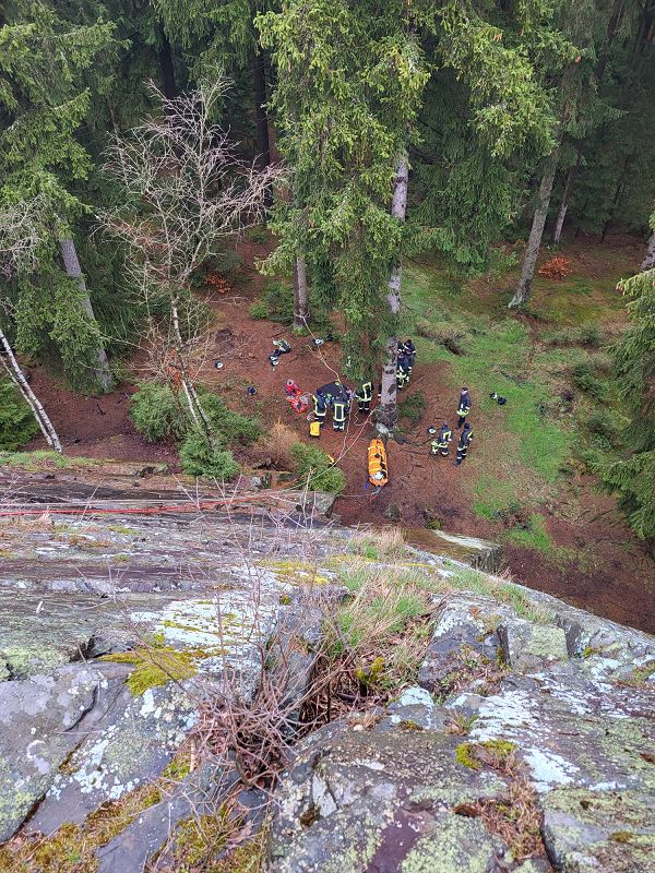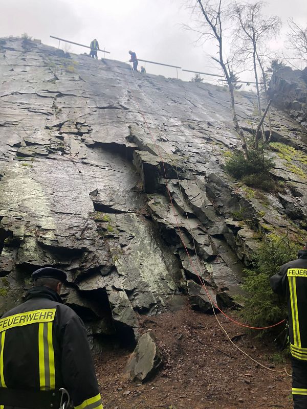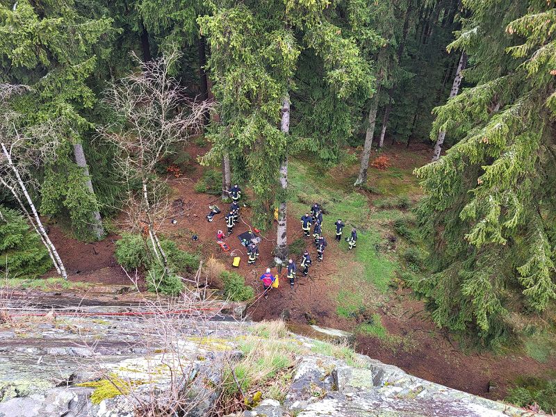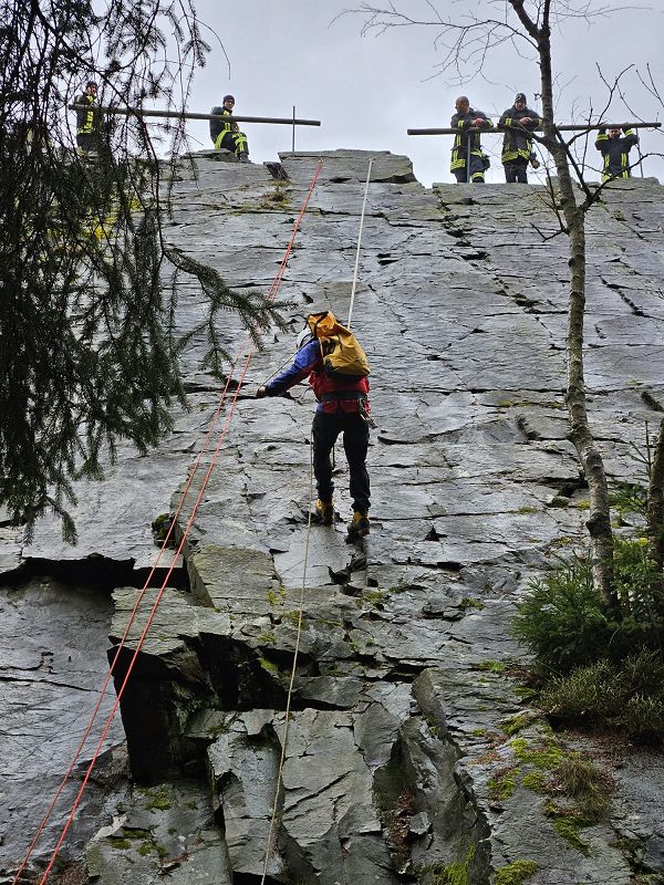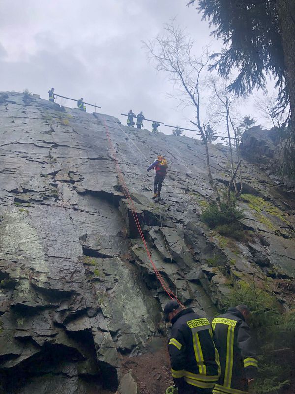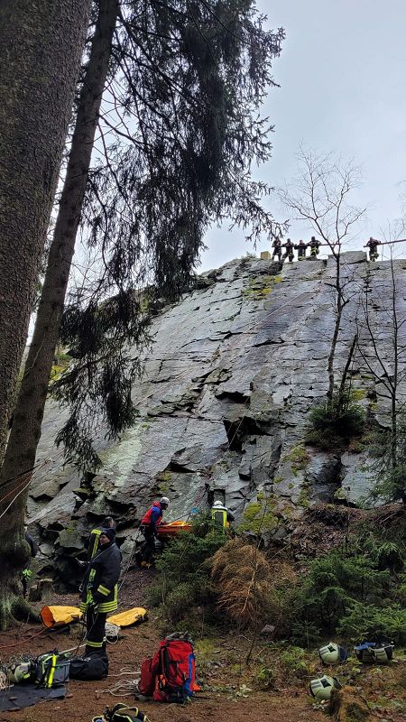 Leichter Nieselregen war nicht gerade optimal für den Ausbildungsdienst zur Rettung von Verletzten aus der Höhe oder Tiefe. Aber wann ist das Wetter schon mal bei Einsätzen optimal? Man kann es sich eh nicht heraussuchen! Dieses Mal ging es zur Ausbildung an die Schrägwand zum Wendelstein, heute ein beliebtes Trainingsobjekt auch für die Bergsteiger. Die waren bei der glatten feuchten Granitwand noch nicht zu sehen-somit hatten die Kameradinnen und Kameraden Ruhe sich mal wieder mit all dem Rettungsgeräten auf dem Löschfahrzeug für die Rettung mit Seil zu beschäftigen.