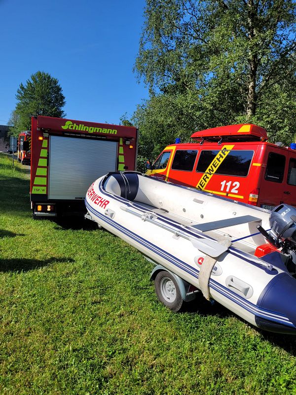 Die Kameradinnen und Kameraden der Feuerwehr übten den Einsatzfall und den Umgang mit dem in Muldenberg stationierten Motor-Schlauchboot. Dieses Wasserfahrzeug wurde extra wegen der Talsperre und dem Badeteich an der Mulde schon vor einigen Jahren angeschafft und wird auch bei Hochwassereinsätzen im Vogtland alarmiert.