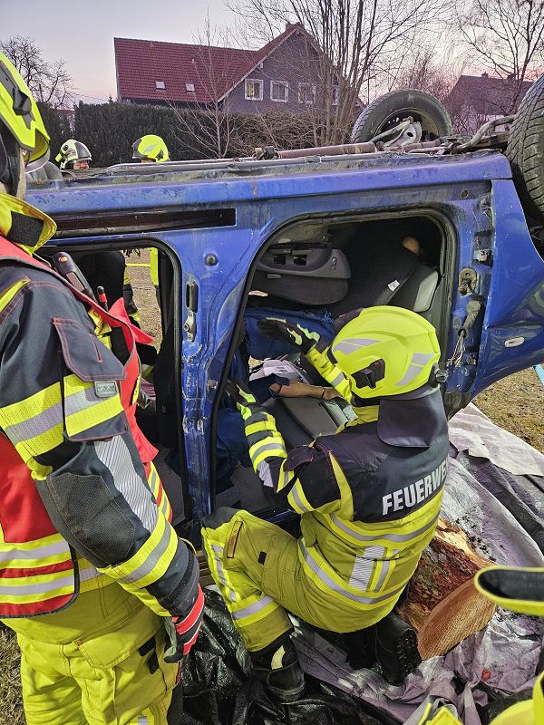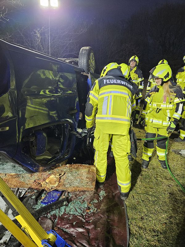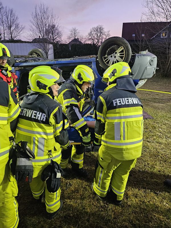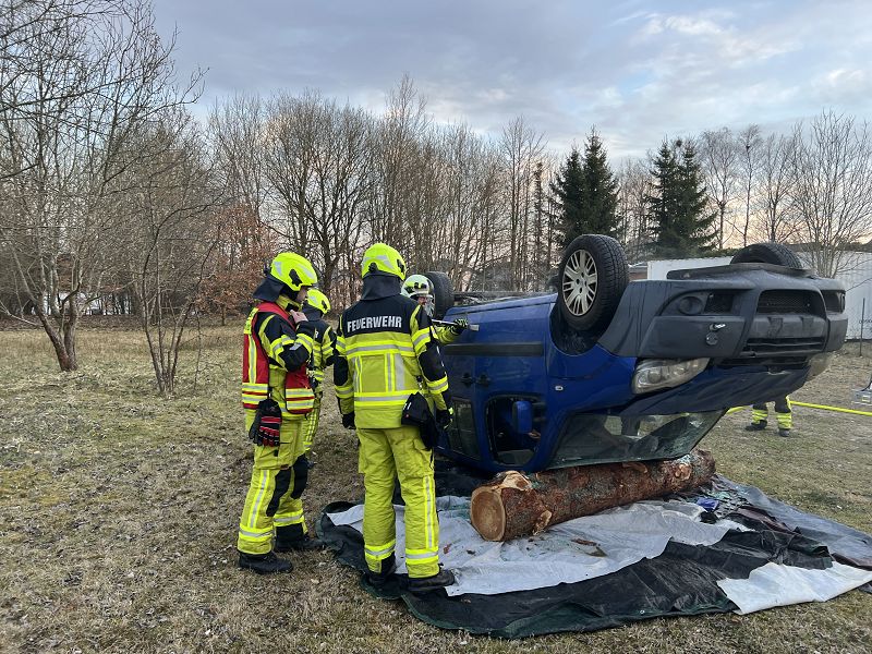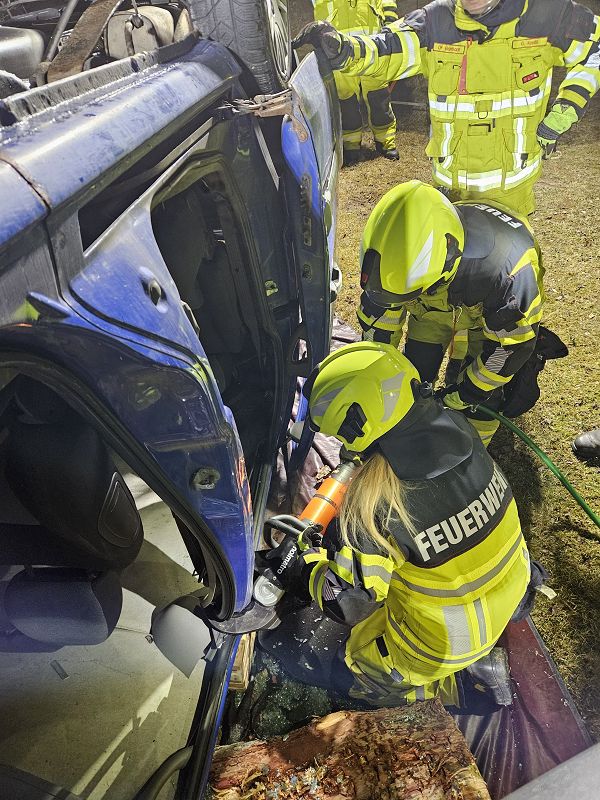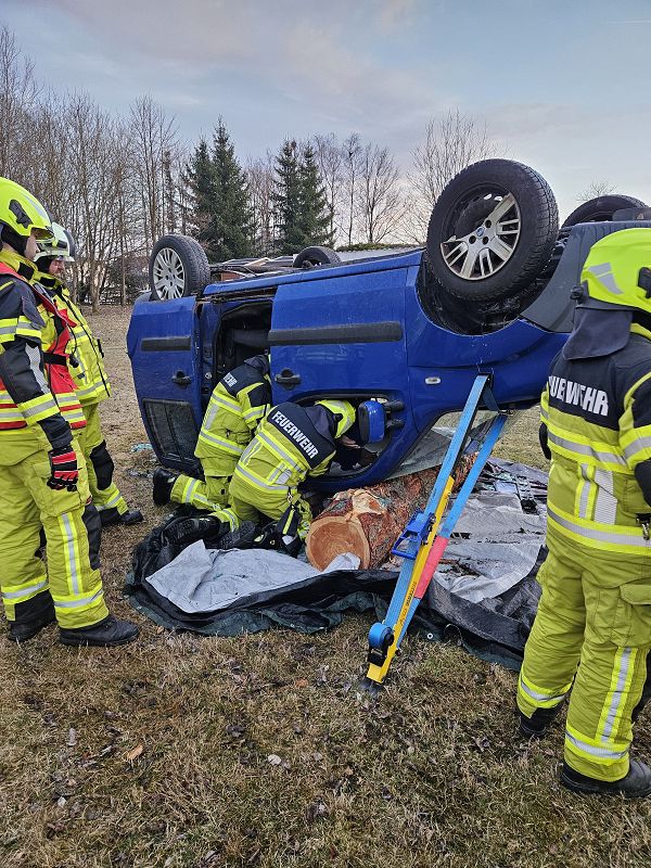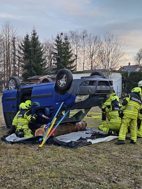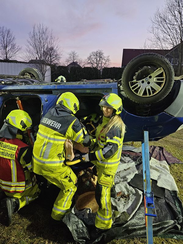 Nachdem der Dummy gerettet werden konnte, konnten Kameradinnen und Kameraden die nicht im Rettungseinsatz eingesetzt waren auch ihre eigenen Kenntnisse beim Umgang der Geräte vertiefen, ehe das Auto wieder mit vereinten Kräften aller Kameraden auf die Räder für den späteren Abtransport gestellt wurde.