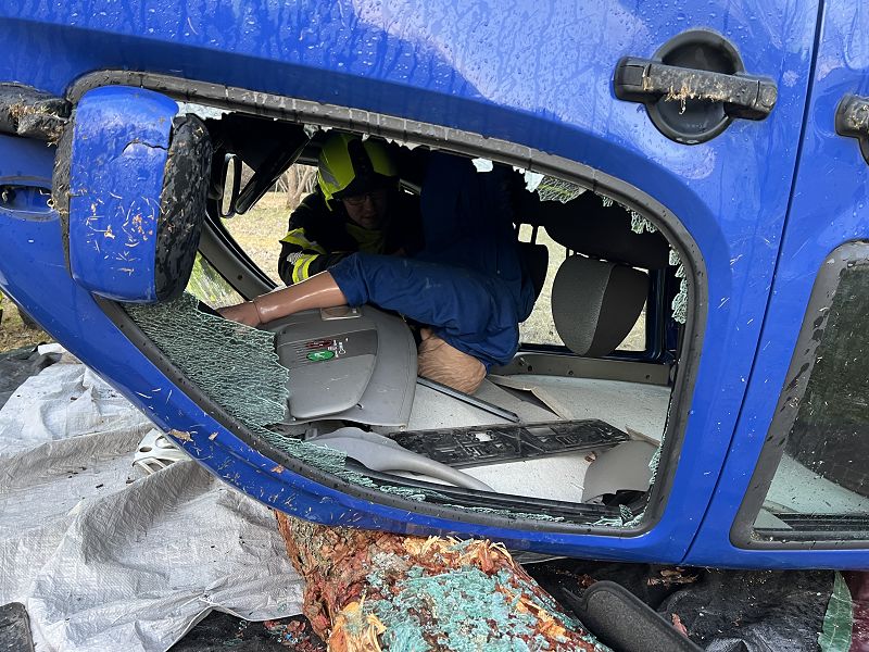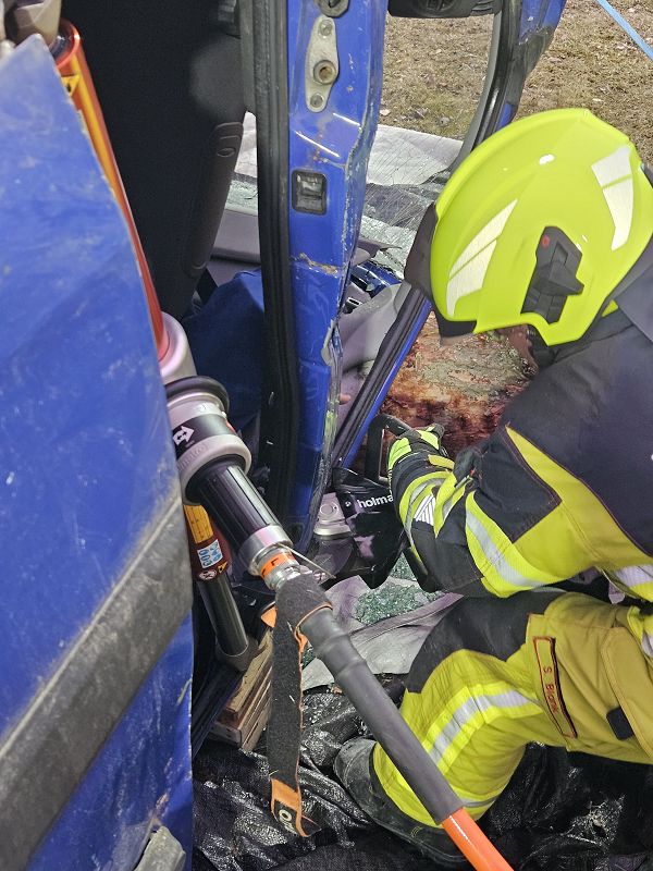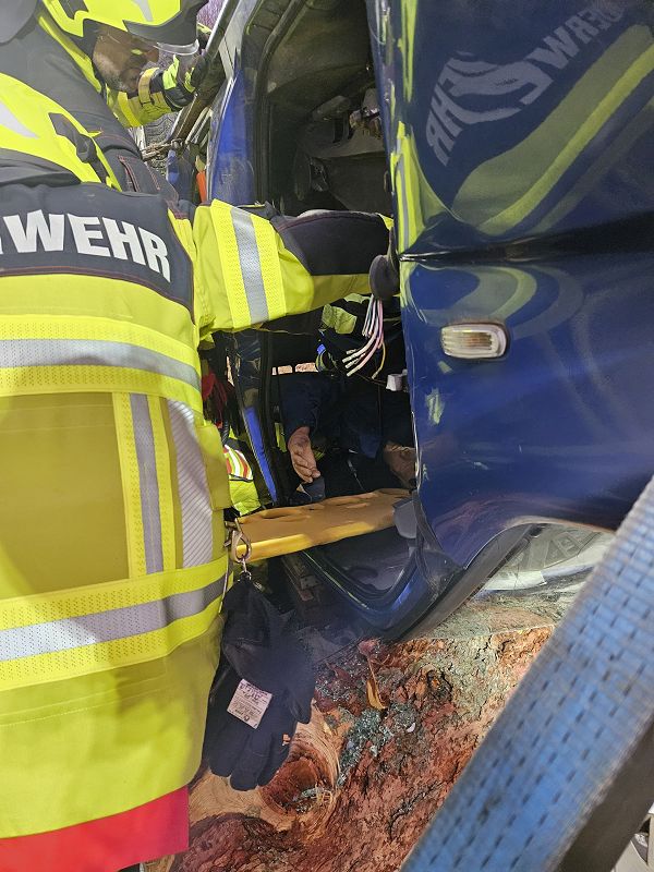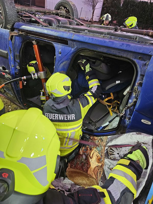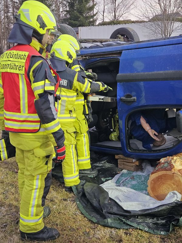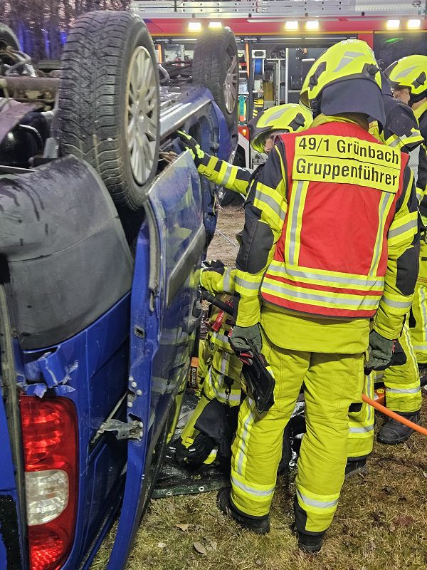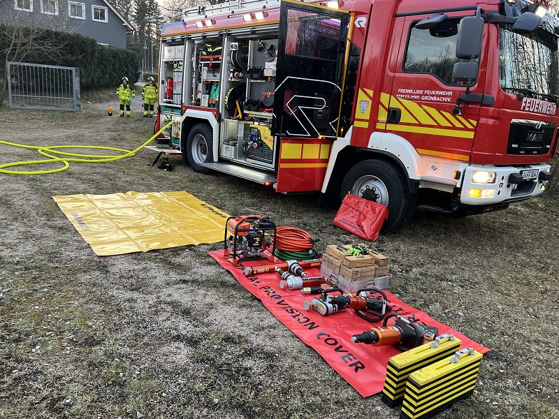 Erschwerend war, das am Lenkrad ein richtiger Dummy mit fast 90 kg in den Gurten hing. Als die Einsatzkräfte an die Einsatzstelle eintrafen wurden sie noch von einem weiteren "Übel" überrascht, denn plötzlich entstand, offensichtlich durch einen Schmorbrand, eine starke Rauchentwicklung im Inneren des Fahrzeuges, was für die verunfallte Person eine weitere große Gefahr darstellte. Für den Gruppenführer und seinem Lageunterstützung eingesetzten Melder war nun dringend eine Festlegung zur Priorisierung der Einsatzaufgaben erforderlich. Belüftung, Brandschutz und Stabilisierung des Fahrzeuges waren somit die ersten Aufgaben. Natürlich durfte die Einsatzstellensicherung nicht fehlen, was die Einsatzkräfte des zweiten Fahrzeuges übernahmen. Der große Teil der, den Grünbachern zur Verfügung stehenden, Rettungsmittel mussten bei dieser Übung eingesetzt werden. Das waren zum Beispiel das Abstützsystem "Stabfast", die hydraulischen Geräte, wie Schere, Spreizer und Rettungszylinder, der wassergeführte Schnellangriff, Glasöffnungs- und Glasschneidegeräte und bei eintretender Dunkelheit auch die gesamte Beleuchtung der Einsatzstelle.