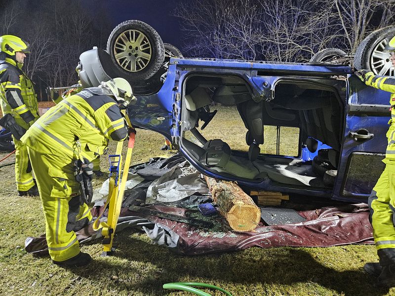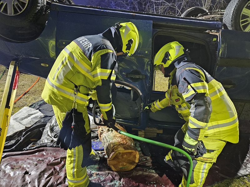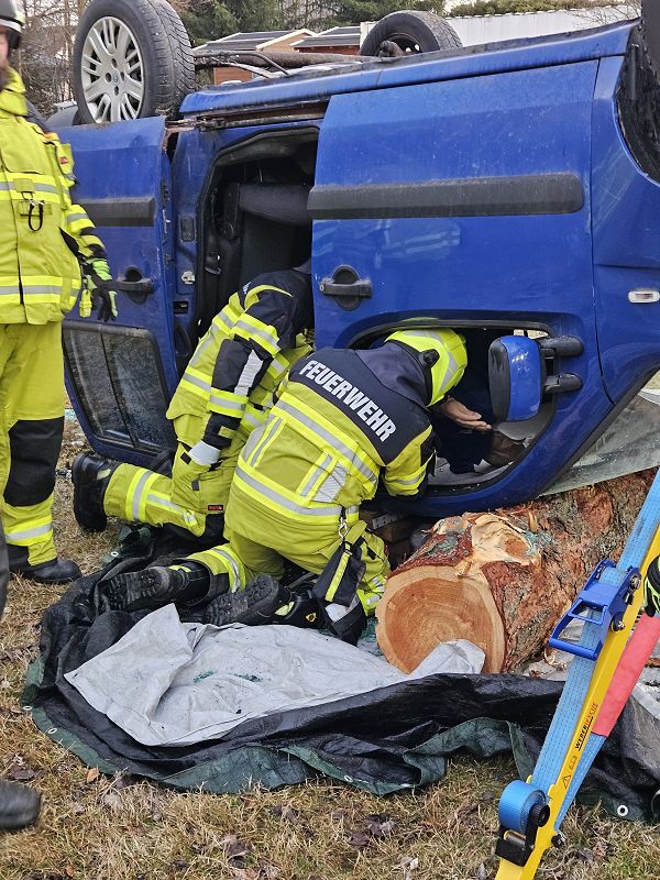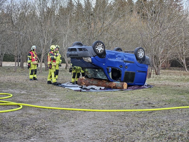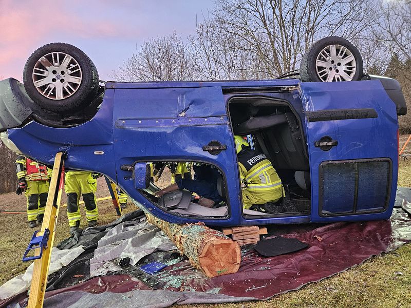 Zur aktuellen Ausbildung hatte sich der eingeteilte Lehrausbilder eine Einsatzlage ausgedacht, die es im Ernstfall der letzten Jahre so noch nicht bei den Grünbachern gab. Und doch könnte es so, oder so ähnlich wirklich einmal eintreffen. Ein Fahrzeug liegt auf dem Dach, in einer sehr wackligen Lage. Diese wurde erzeugt, indem das Auto auf einen Baumstamm mittig gelegt worden ist. Sobald man die Gewichtsverhältnisse hätte im Einsatz geändert, würde das Fahrzeug zum Motor hin abkippen.