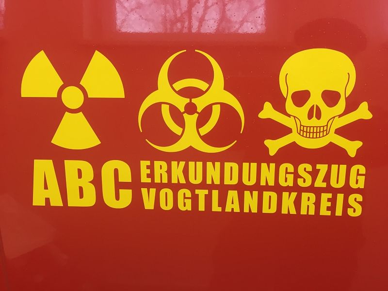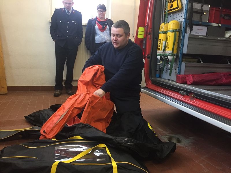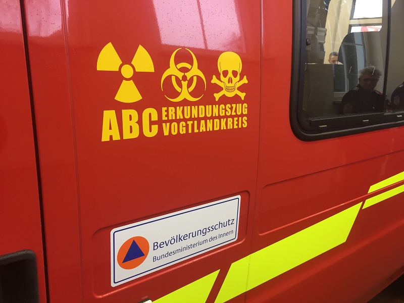 Christian Wetzig, Wehrleiter der FF Rodewisch ist gleichzeitig Fachberater ABC im Vogtlandkreis. Heute konnten die Grünbacher Kameraden durch Ihn ein Erkundungsfahrzeug als eine der Einsatzkomponenten des Gefahrgutzuges aus dem Vogtlandkreises kennenlernen. Darüber hinaus informierte Christian über das eingeführte Stufenkonzept zur Alarmierung bei Gefahrguteinsätzen im Landkreis. Je nach Alarmierungsstufe rücken bei Anforderung der Gefahrgutkomponente durch den jeweiligen Einsatzleiter zwischen 6 und 10 Spezialfahrzeuge an die Einsatzstelle an. Und diese sind dann mit bis zu 50 Einsatzkräften besetzt. Das zu koordinieren erfordert geschulte Leute. Leider finden sich diese Männer immer weniger. Und so ist es nicht selten, daß eine derartig aufwendige Ausbildung mit vielen Lehrgängen an der Landesfeuerwehrschule über 10 Jahre andauern kann.