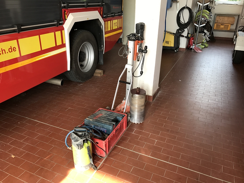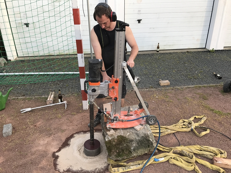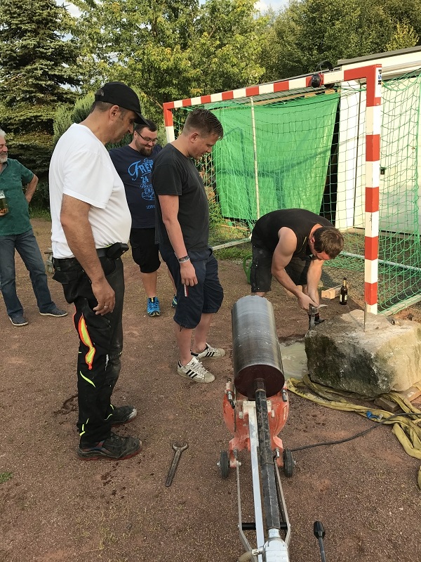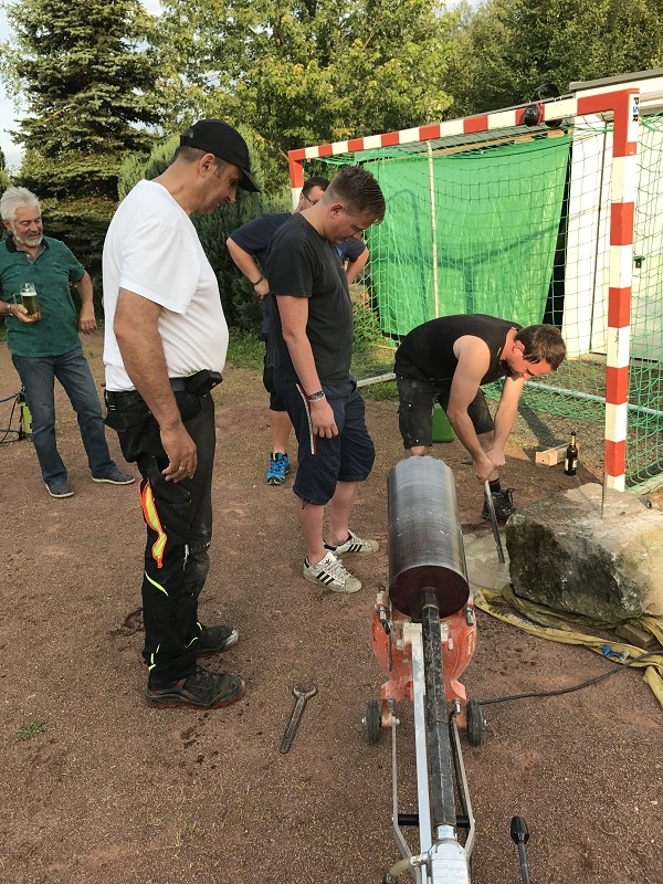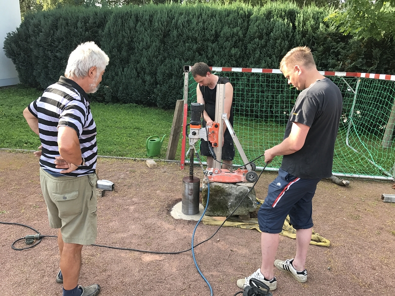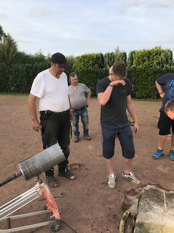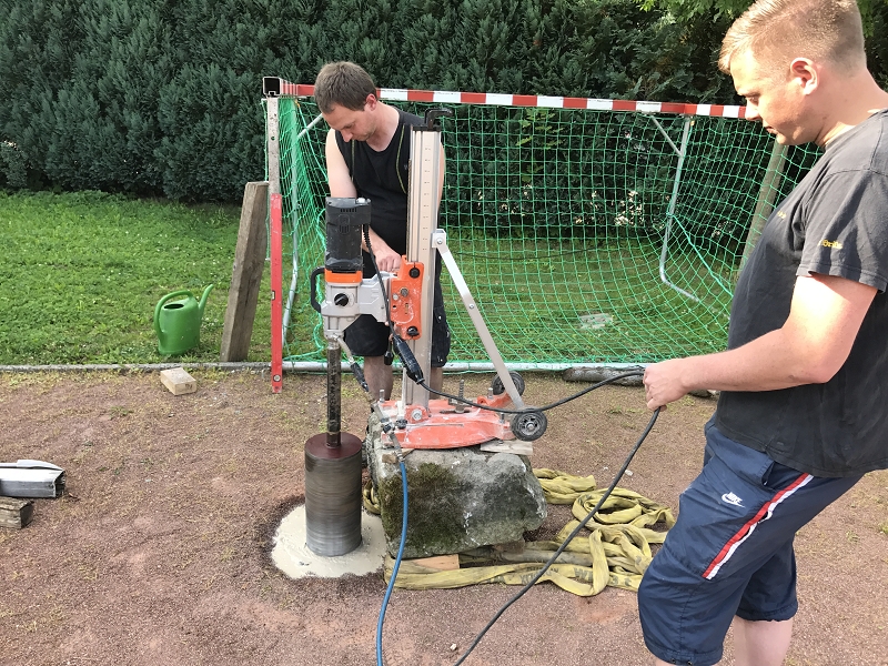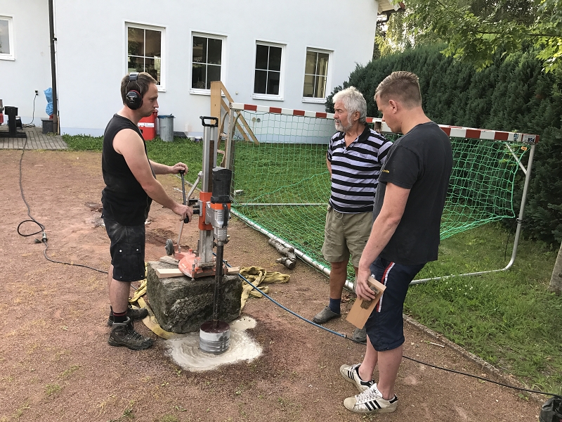 Zunächst wurde das Kernbohrgerät von der Landschaftsbaufirma "Fachcenter Garten" aus Heinsdorfergrund zur Verfügung gestellt. Ein Gegengewicht kam von einem Kameraden, der wiederum den Radlader vom Brennstoffhandel Ebert aus Grünbach nutzen durfte. Eine Verlängerung zur Kernbohrspindel kam von einem ortsansässigen Klempner, ehe dann die Arbeiten so richtig beginnen konnten.