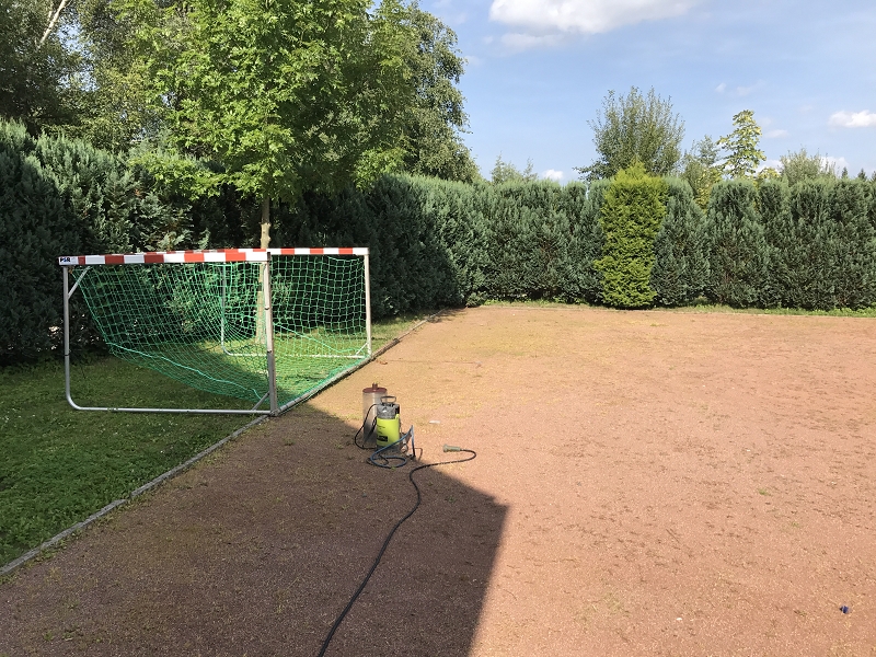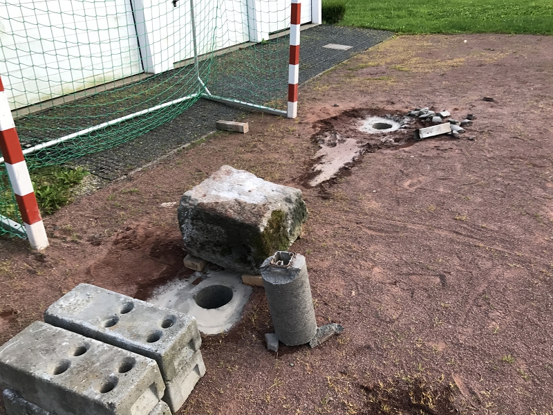 Nachdem die Tore schon einmal eingebaut waren, kam es in den Steckhülsen der Fußballtore zu einer Aluminiumausblühung, die dazu führte, dass die Steckhülsen der Tore weder vernünftig in die Hülsen gingen, noch wieder gut heraus. Das ist aber wichtig um die Kippsicherheit der Tore zu garantieren.