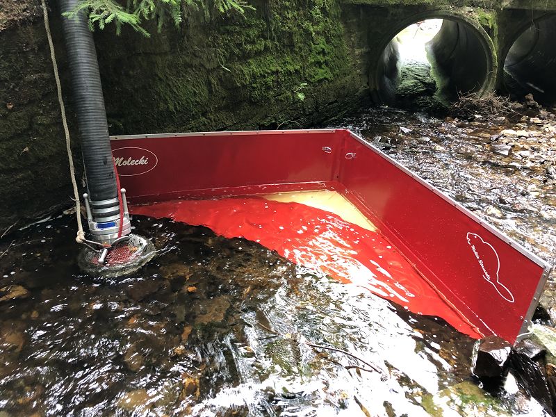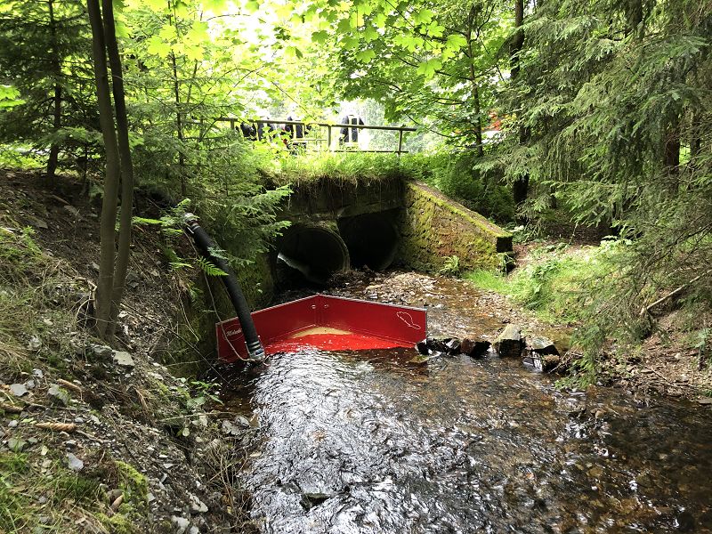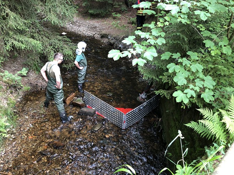 Das Löschwasser-Rückhaltesystem stellt eine einfache Barriere dar, welche es ermöglicht aus Bächen mit Niedrigwasser trotzdem Löschwasser entnehmen zu können.