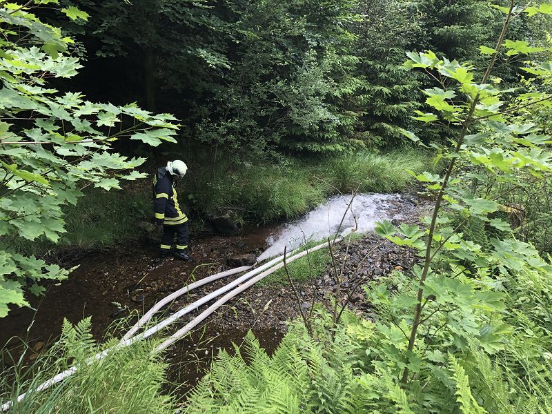 Eine zweite Löscheinheit hatte alle der Wehr zur Verfügung stehenden Pumpen zum Einsatz gebracht und sorgten dann für eine "trockene" Göltzsch, wenn auch nur in kurzer Zeit.