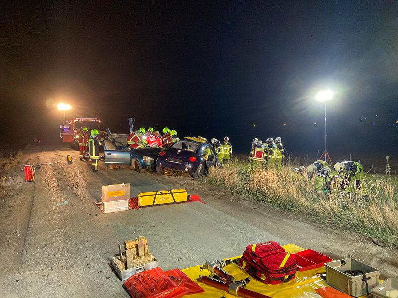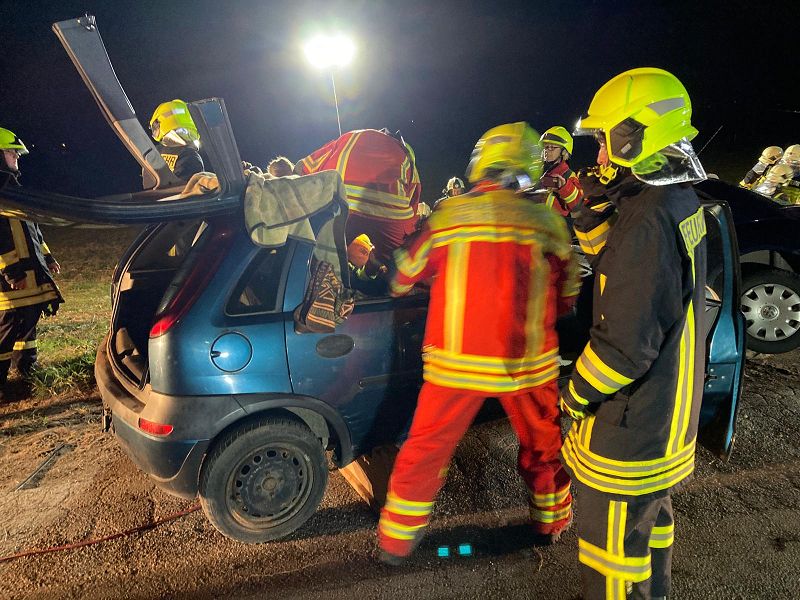 Schauplatz war die Zufahrtsstraße zum Recyclinggelände der NBG. Dort herrschte zu dieser Zeit schon Ruhe und es wurde niemand gestört. Bei dem simulierten Unfall sind zwei PKW zusammengestoßen, die beiden Fahrer waren verletzt, mussten aus den Fahrzeugen durch Auftrennen der Fahrzeugkarosserie befreit werden. Der alarmierte Rettungsdienst aus Falkenstein nahm die Verletzten dann in dessen Obhut. Alle Kameradinnen und Kameraden hatten wieder einmal die Möglichkeit, alle hydraulischen Rettungskomponenten zu beüben und auch gemeinsam zu trainieren.