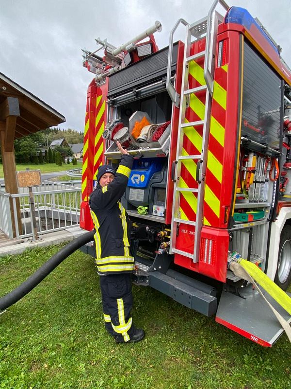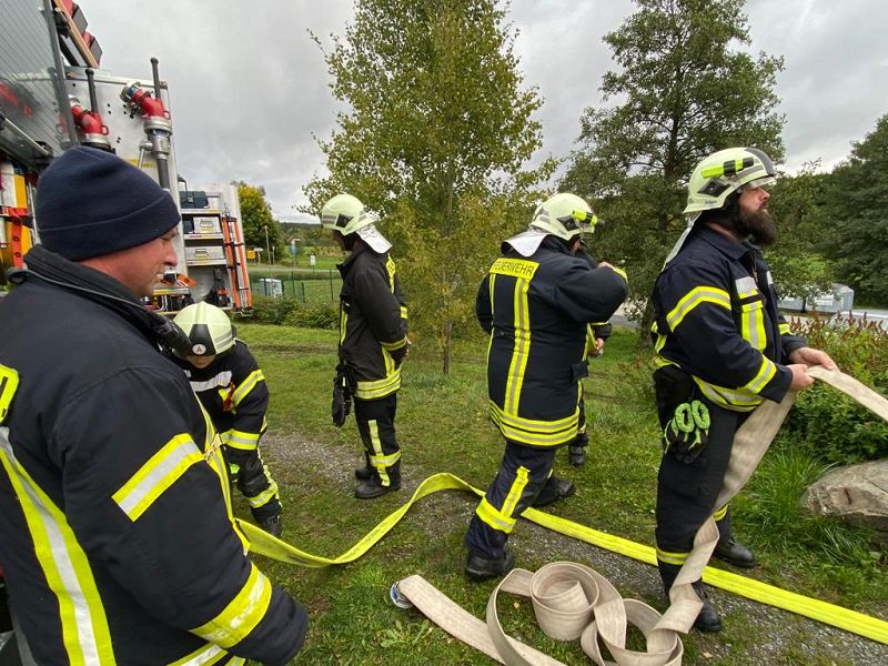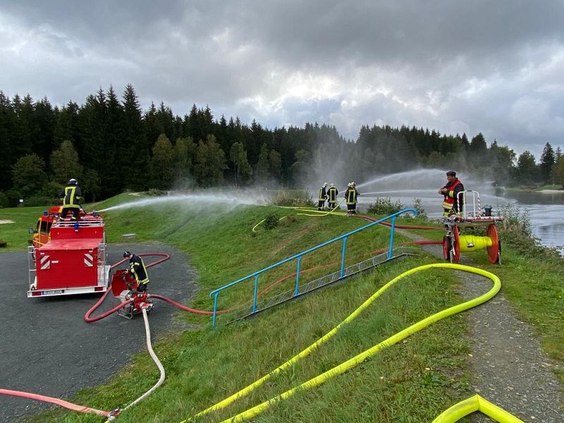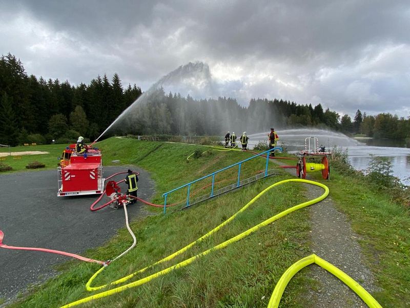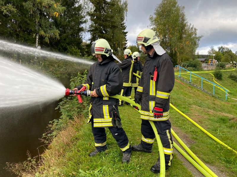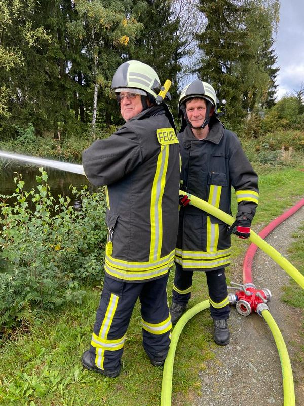 Nach "gefühlt" Monaten geprägt von Terminen des Feuerwehr - Vereines konnten sich die Kameradinnen und Kameraden endlich mal wieder ihrer ursächlichen Ambition, dem Feuerwehrdienst widmen. Und man hat es ihnen angemerkt, mit welcher Begeisterung der eine oder andere an die sache ging! Ort des Geschehens war der Ortsteil Muldenberg. Es galt über die vorbereitete Löschwasserentnahmestelle am Muldenteich, dem Auslaufbauwerk der Muldenberger Talsperre, eine Löschwasserversorgung zu installieren und stabil zu betreiben.