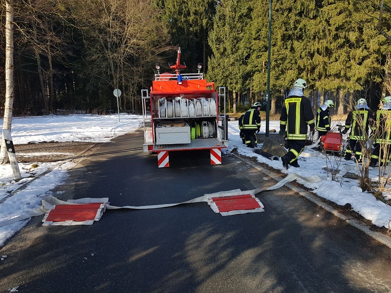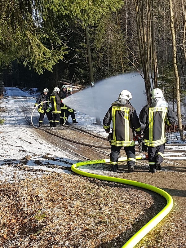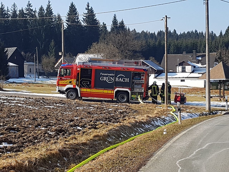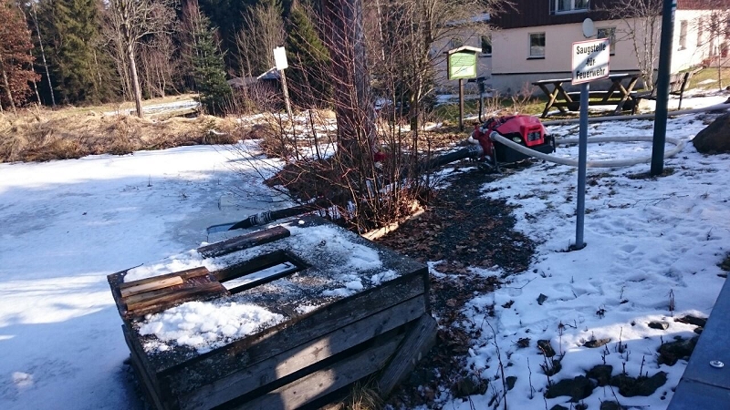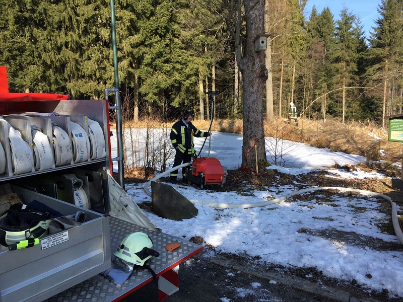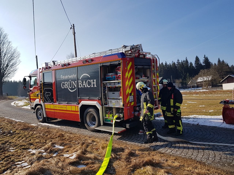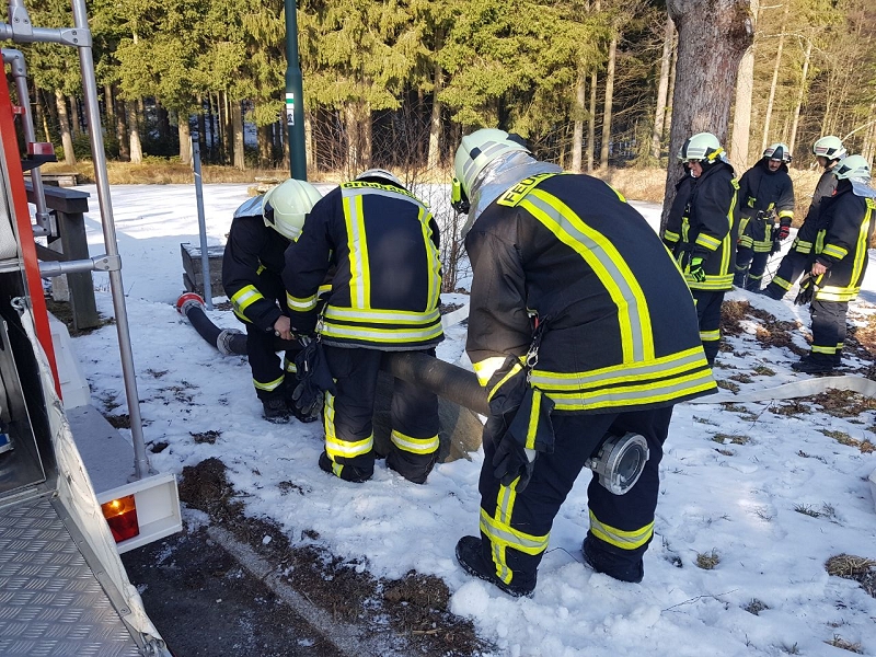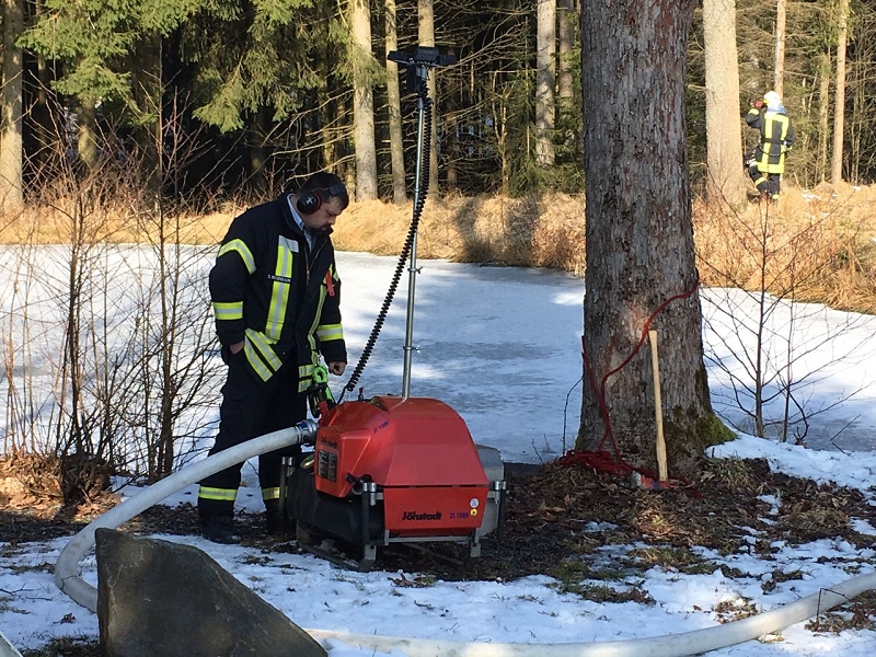 Heute war alles etwas anders. Die Technik sprang an, die Maschnisten waren perfekt auf ihre Fahrzeuge eingestellt und mehr als 1.000 Liter Löschwasser strömte pro Minute durch die Strahlrohre. Und selbst die 20 cm Eis auf dem Löschwasserteich konnte die Grünbacher nicht aufhalten. Auch das war ein Novum!