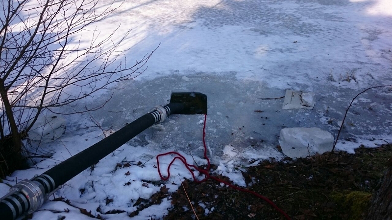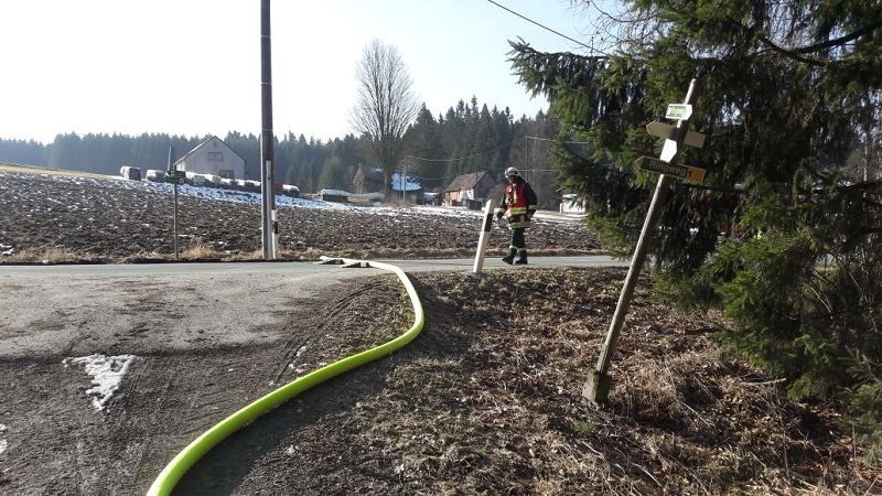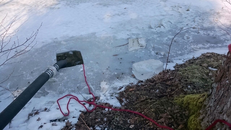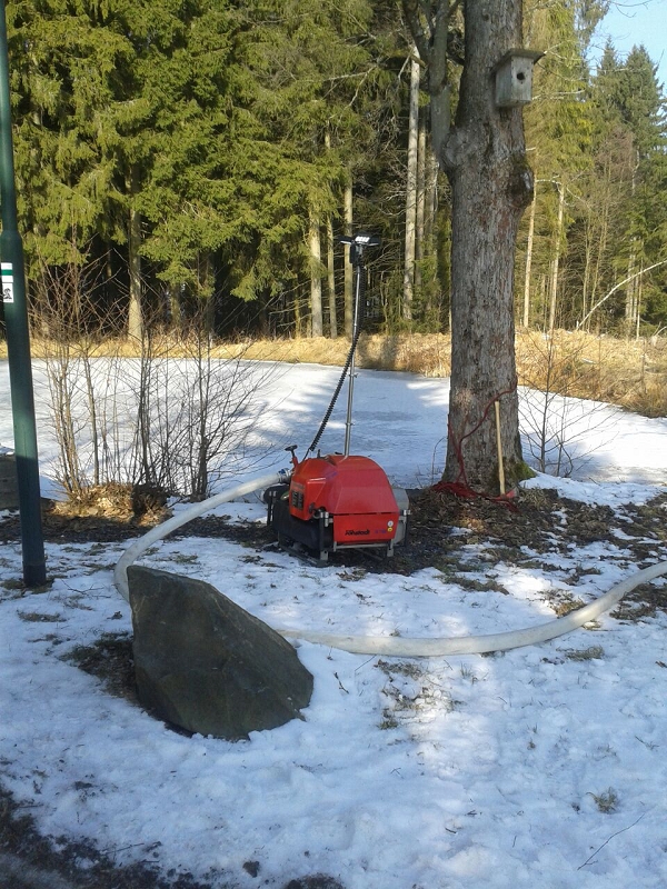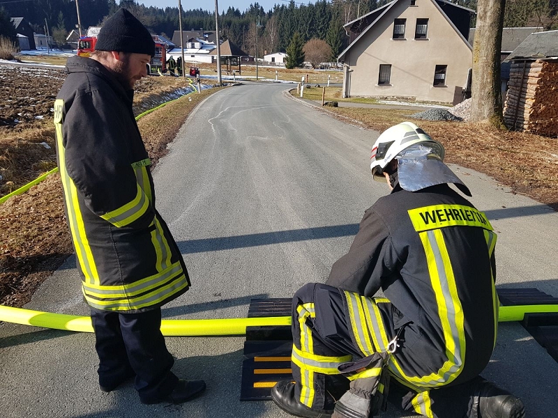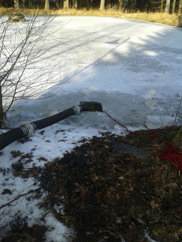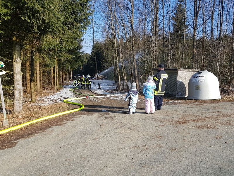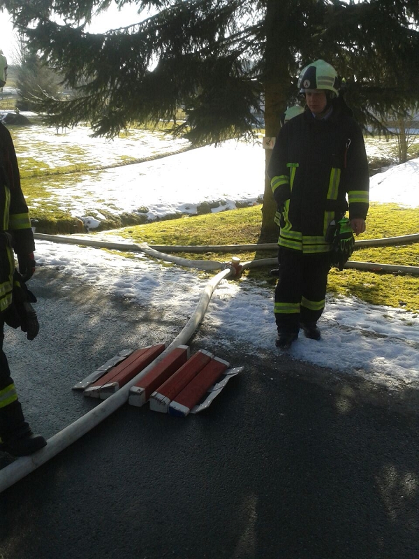 Heute war alles etwas anders. Die Technik sprang an, die Maschnisten waren perfekt auf ihre Fahrzeuge eingestellt und mehr als 1.000 Liter Löschwasser strömte pro Minute durch die Strahlrohre. Und selbst die 20 cm Eis auf dem Löschwasserteich konnte die Grünbacher nicht aufhalten. Auch das war ein Novum!