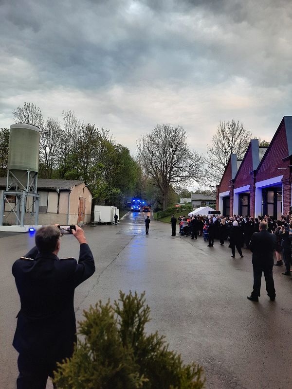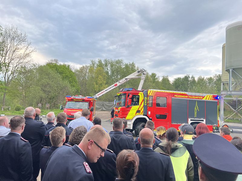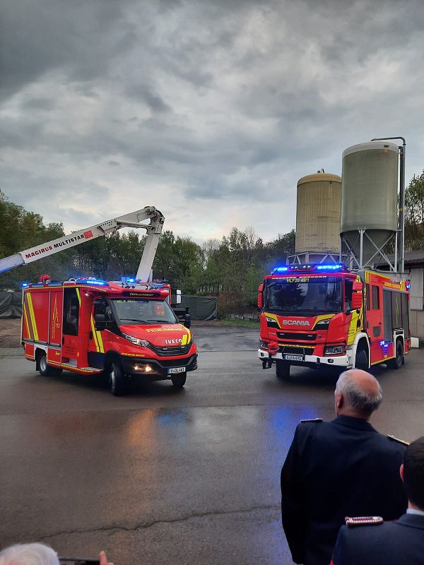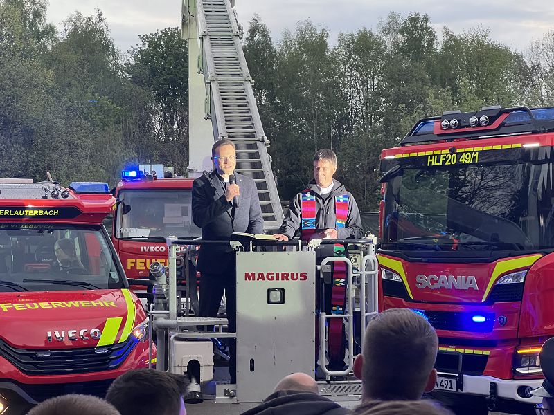 Im Anschluss wurden die beiden Fahrzeuge durch den evangelischen, sowie dem katholischen Pfarrer in luftiger Höhe und im Scheinwerferlicht geweiht und erstmals nass- nicht vom Löschwasser, sondern vom Weihwasser.