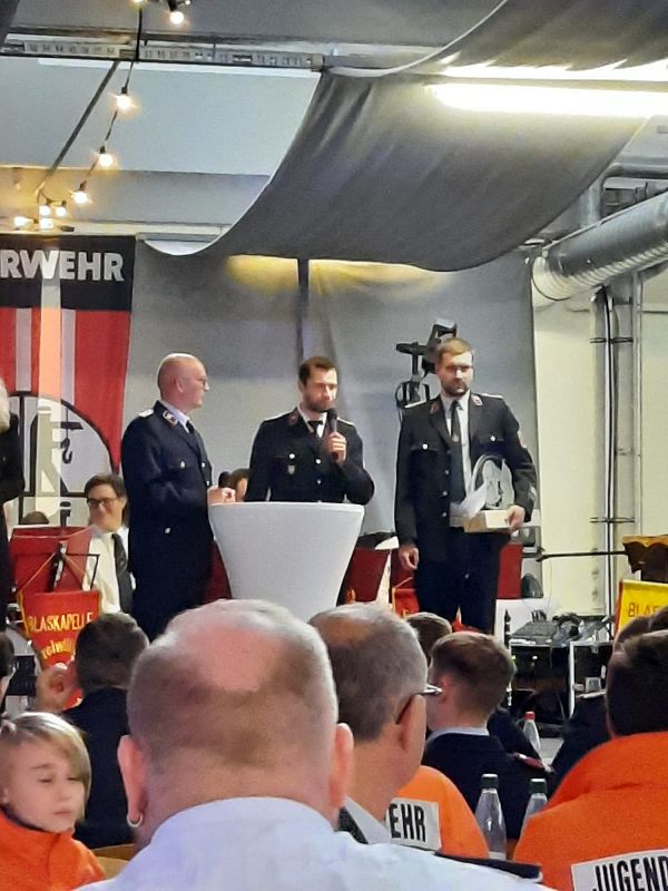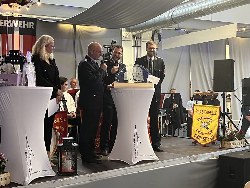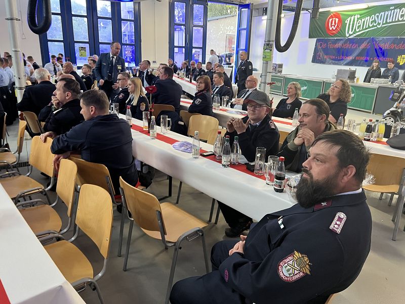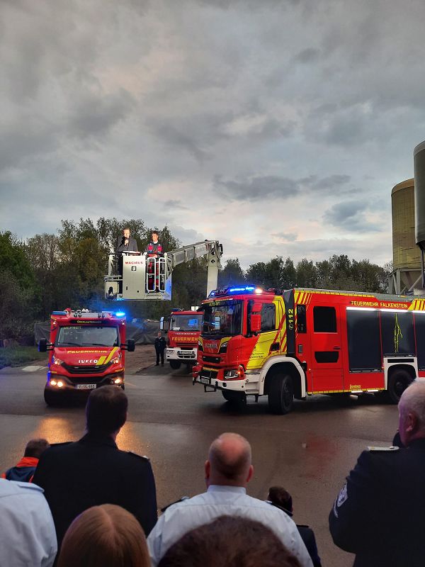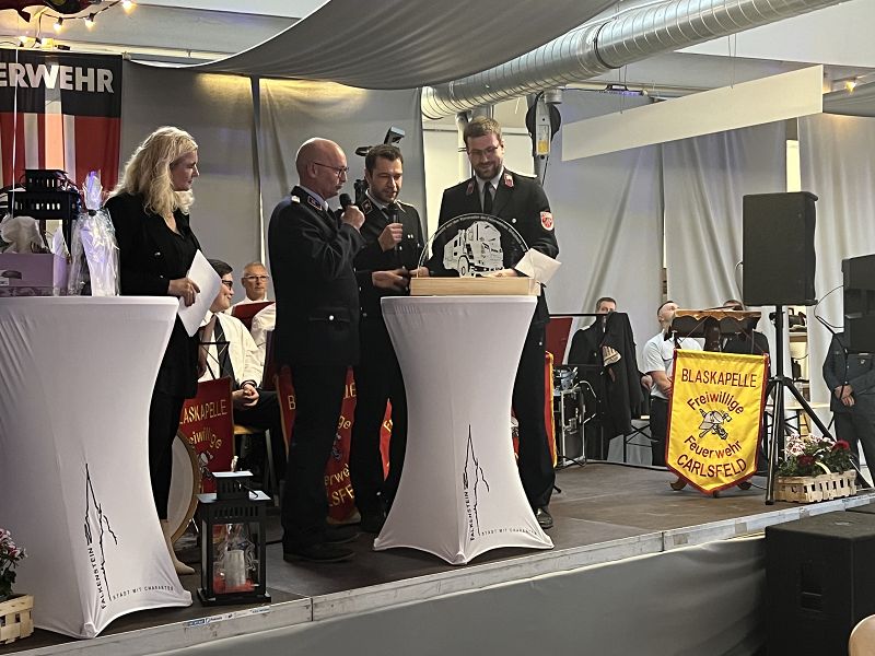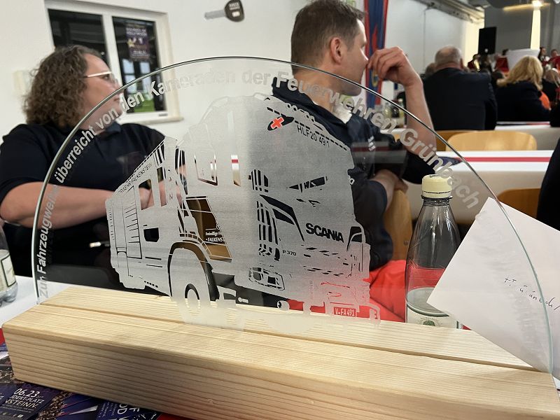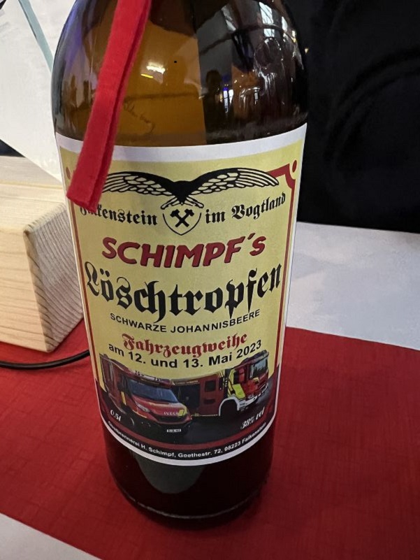 Auch eine Grünbacher und Muldenberger Delegation durfte an der streng limitierten Festveranstaltung teilnehmen. Neben einer Spende für T-Shirts für die eigene Stadt-Jugendfeuerwehr schenkten Gemeindewehrleiter Michael Breitfeld mit seinem Stellvertreter Nils Golla einen beleuchteten gläsernen Schwibbogen mit dem Motiv des neuen Falkensteiner Löschfahrzeuges.