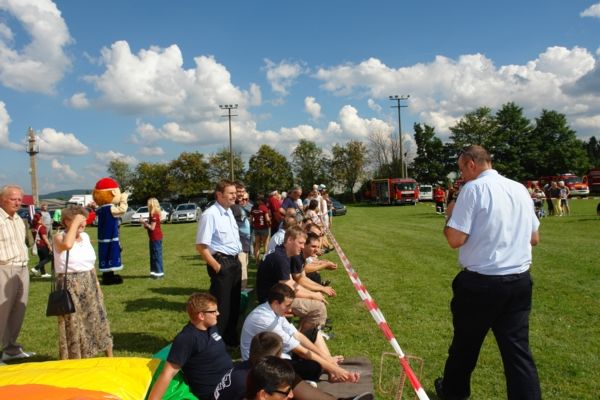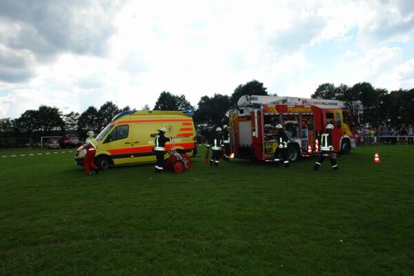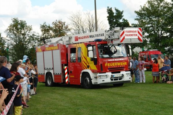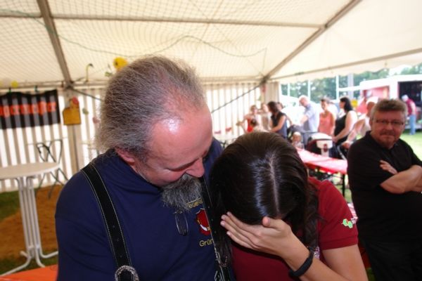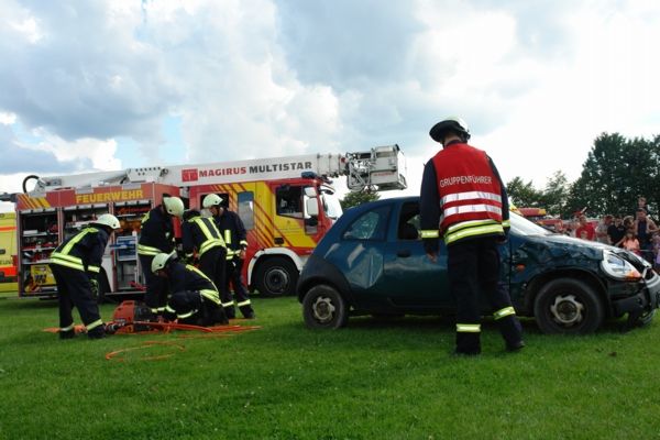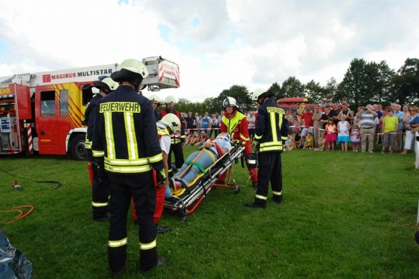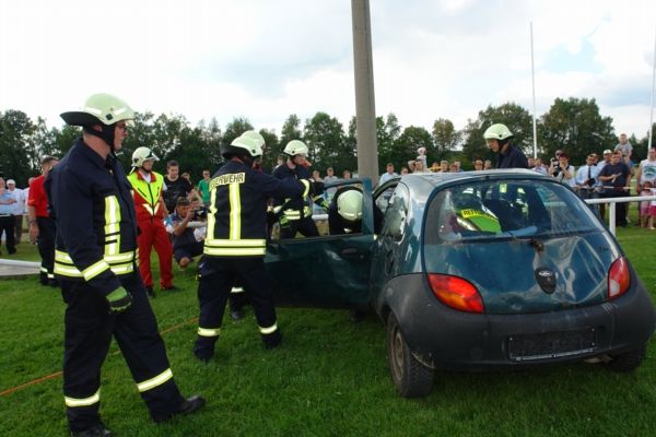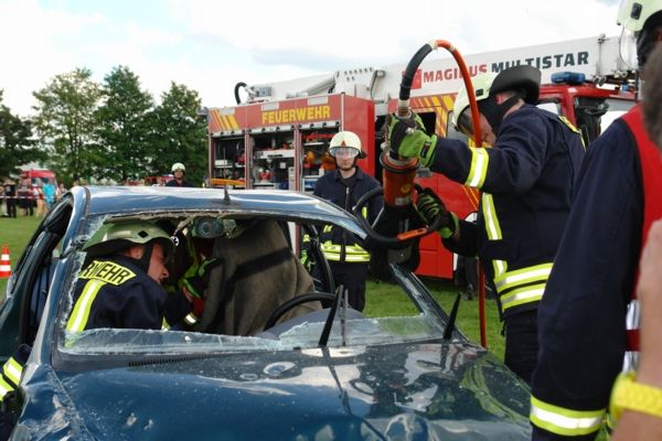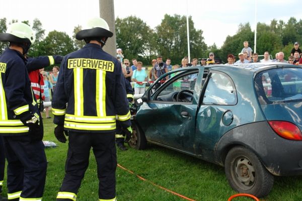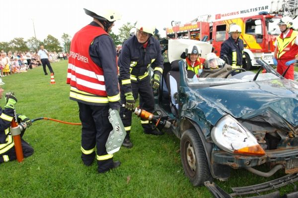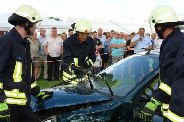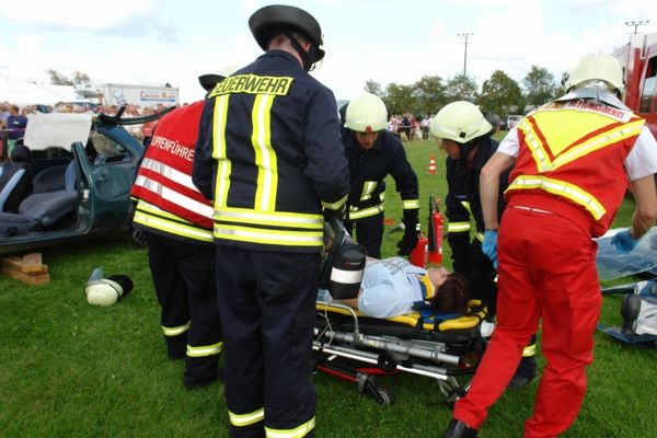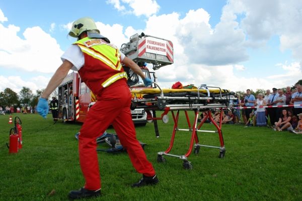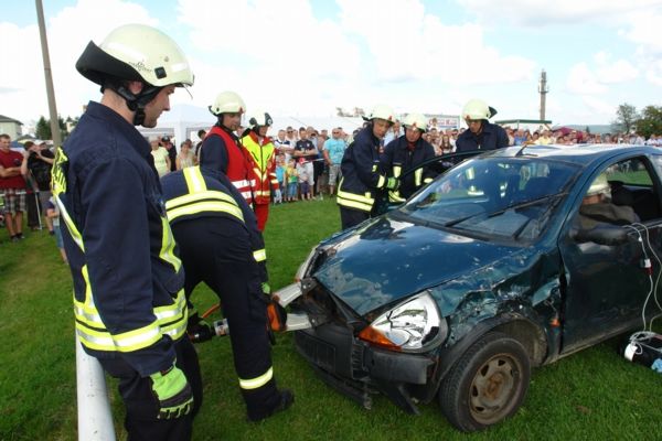 Während im Zelt der Höhepunkt in Sachen Blasmusik starteteund das Grünbacher Blasorchester zum Konzert aufspielte wurde der Nachmittag am Außengelände mit einer Einsatzübung zur technischen Hilfeleistung bei einer PKW-Bergung durch die Kameraden der FF Falkenstein mit den Kollegen des ASB Falkenstein beendet. Neben der Fahrzeugtechnik die auf dem Festgelände besichtigt werden konnte, hatte die Kinder noch eine Menge mehr zu beschnuppern. So das Infomobil des Landesfeuerwehrverbandes, betreut durch Grünbacher Kameraden mit deren Familien. Und natürlich der Stand der Diakonie mit ihren schönen Spielen.