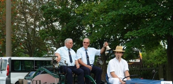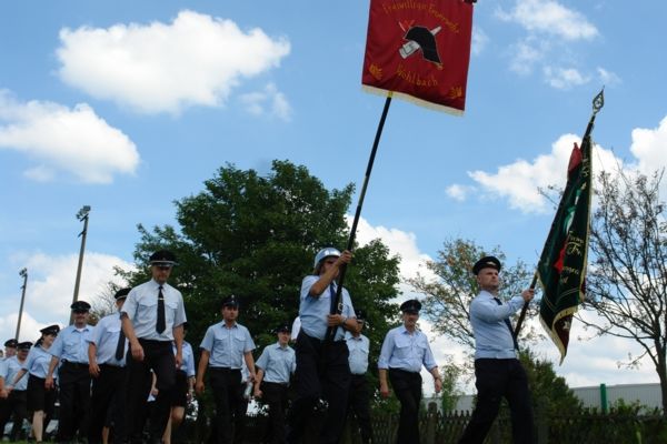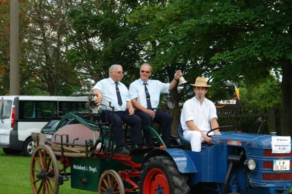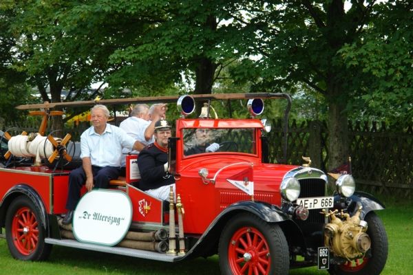 Nach einer kurzen Verschnaufpause sammelten sich alle befreundeten Feuerwehren zum Fahrzeugumzug. Mehr als 35 Feuerwehrfahrzeuge von der Gründerzeit bis zum modernsten Hilfeleistungsfahrzeug hatte die Grünbacher Kameraden eingeladen und geschickt zusammengestellt. Mit dabei natürlich ein ähnlicher Audi, wie ihn die Grünbacher als erstes motorisiertes Fahrzeug besaßen und natürlich der LO. Umrahmt wurde der Umzug vom Marschblock der Goldkronacher Kameraden und dem Fahnenkorso. Stolz saßen unsere Altkameraden auf dem alten Feuerwehrfahrzeug von Frank Plobner. Auch ein Brandstifter durfte natürlich nicht fehlen.