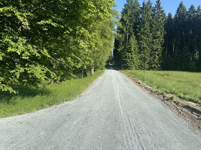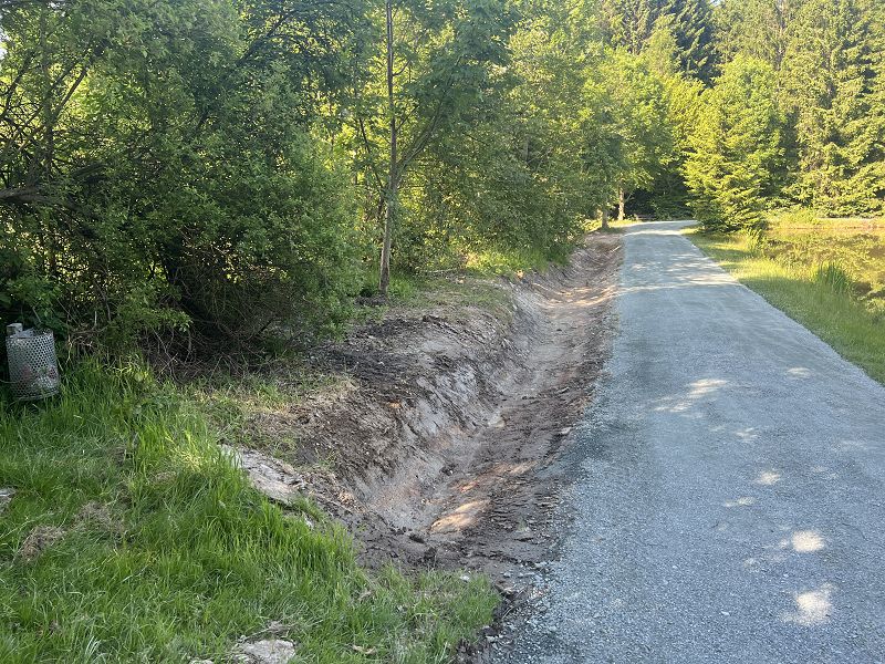 Gerade auf der Ortsseite war der Weg weich und morastig. Für die Zufahrt schwerer Feuerwehrfahrzeug ungeeignet. Nun wurde durch die Firma Ferdinand Schön, im Auftrag des Bürgermeisters, die Zufahrt ausgekoffert und mit Frostschutz und Feinsplitt neu ausgebaut.