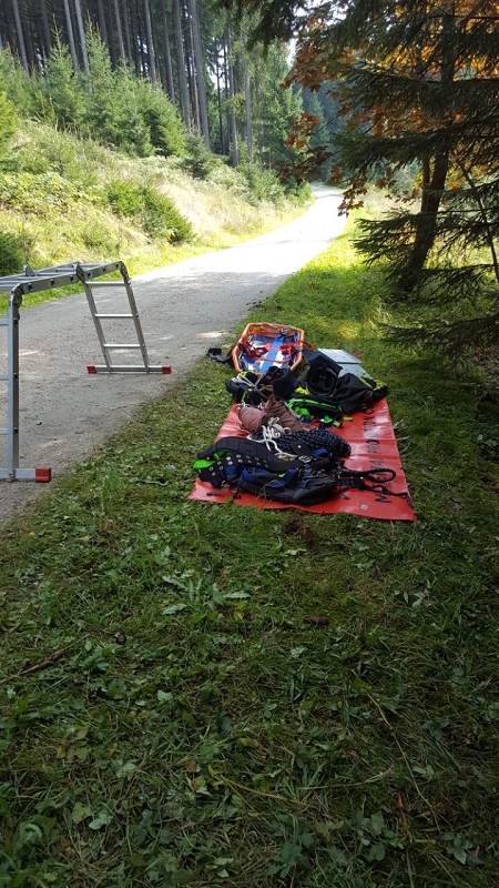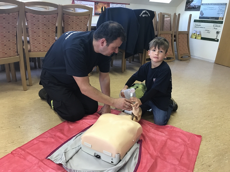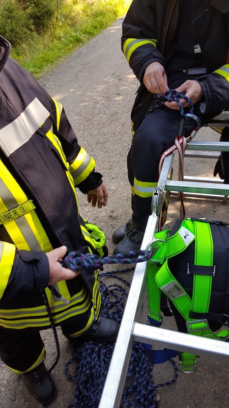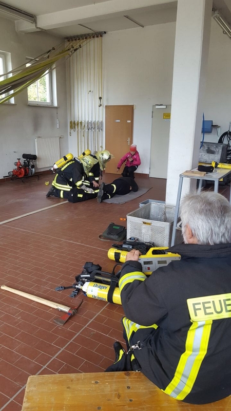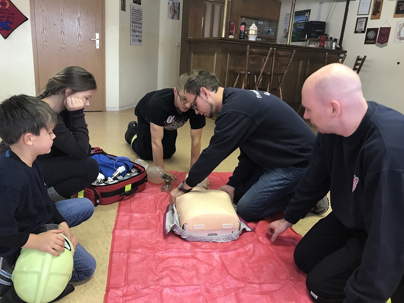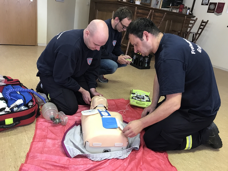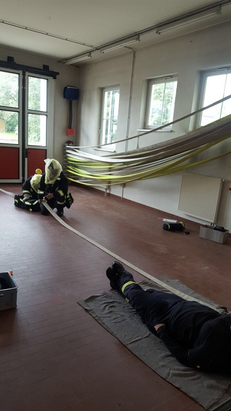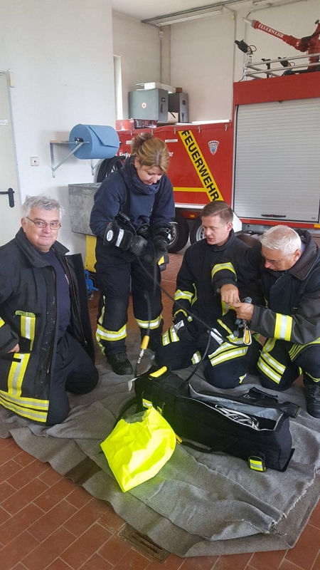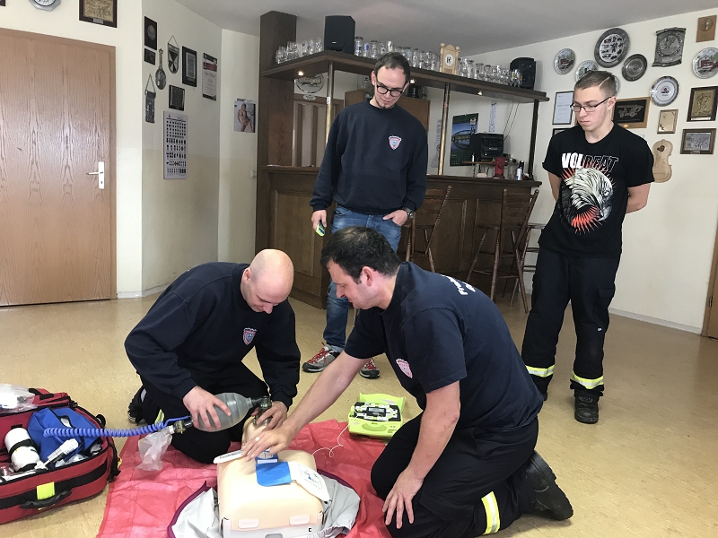 Im Göltzschtal wurde das Retten und Bergen aus großer Tiefe mit Seilen, der Schleiftrage und vielen anderen Gerätschaften der Grünbacher Wehr geübt. Darüber hinaus stand natürlich auch die Knotenlehre auf dem Lehrprogramm. Ausbilder war der Wehrleiter Michael Breitfeld selbst und die über 2 Stunden Lernzeit ließen endlich einmal ausführliches Training und viele Fragen zu. Im Obergeschoss des Feuerwehrhauses schult Rettungssanitäter Ivo Winterstein von unserer Wehr die Kameradinnen und Kameraden zum Thema Herzinfarkt und Schlaganfall. Dabei standen die Notfallgeräte des Löschfahrzeuges, wie das Sauerstoffbeatmungsgerät mit Beatmungsbeutel, das Pulsoxymeter und die beiden Notfallrucksäcke der beiden Fahrzeuge im Mittelpunkt der Ausbildung. Höhepunkt war die Schulung an einem Reanimationsgerät für "Jedermann" um im Ernstfall damit umgehen zu können. Viele dieser Geräte findet man heute in Einkaufszentren.