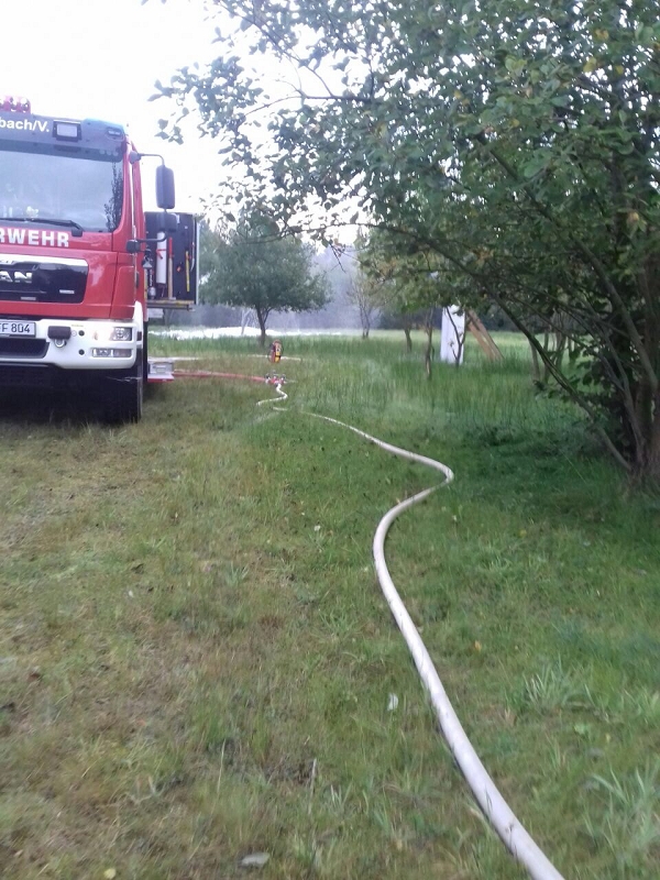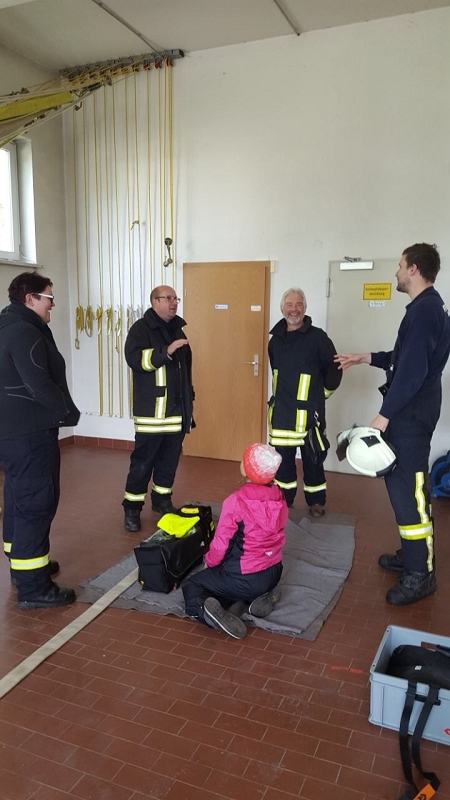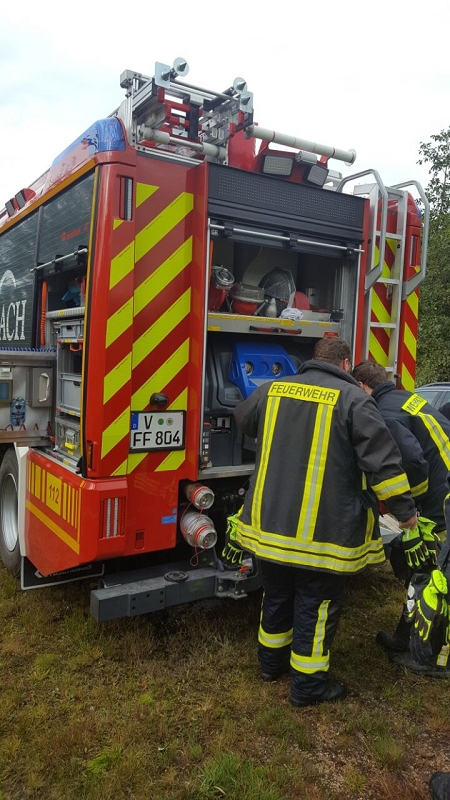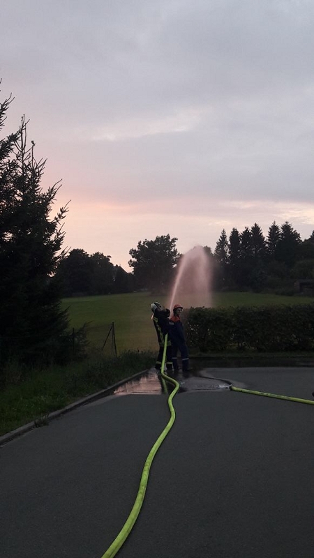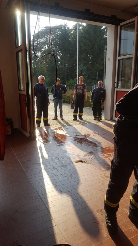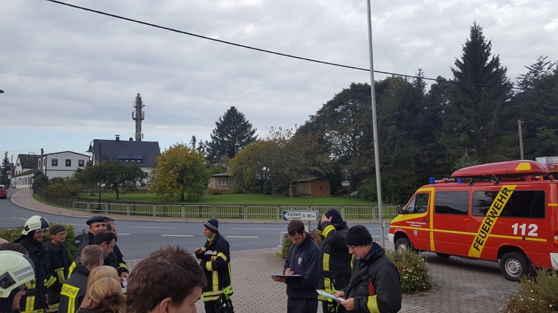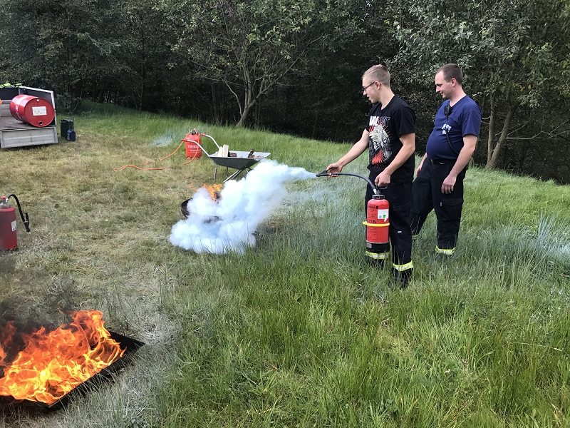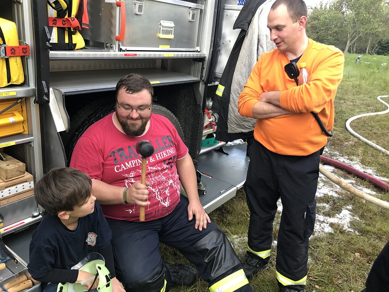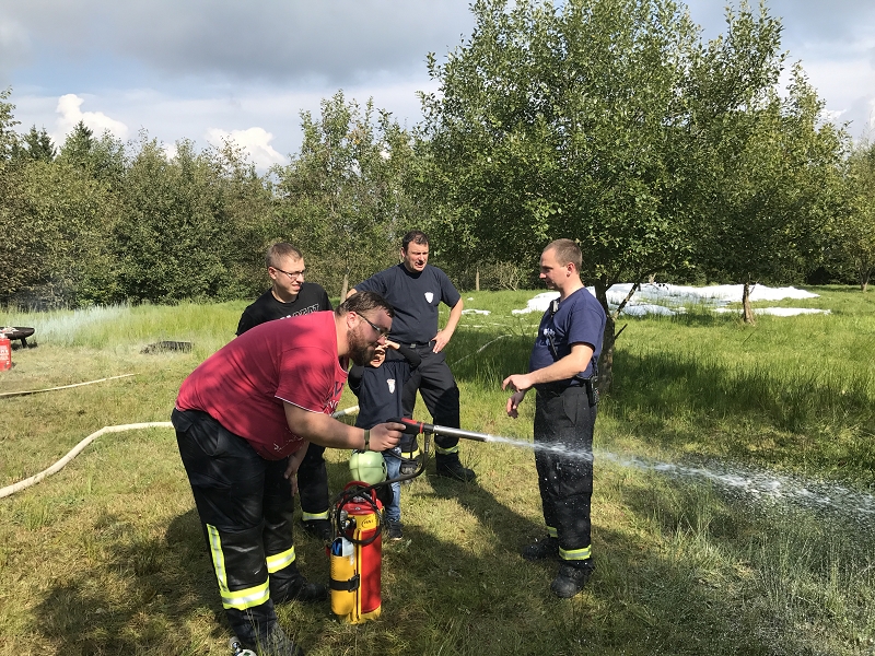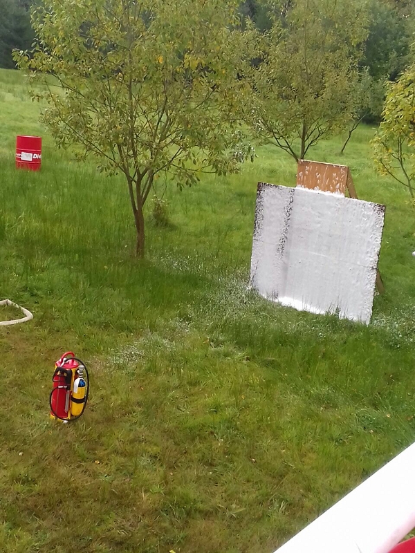 An der vierten Station wurde durch Ausbilder Daniel Kern und seinem Maschnisten Felix Buchheim ein breites Wissen zum Thema Löschen vermittelt. Dabei wurden alle auf dem Fahrzeug vorhandenen Löschmittel demonstriert und Vor- und Nachteile erläutert. Mancher nicht so am regelmäßigen Ausbildungbetrieb teilnehmende Kamerad staunte heimlich nicht schlecht, welche Vielfalt an Einsatzmöglichkeiten unser neues Löschfahrzeug mit sich führt. Interessant war insbesondere die Handhabung des Kleinlöschgerätes HighCafs mit seinem hervorragend haftenden Löschschaum. Stunden später haftete der Schaum noch an der Demowand. Die Schulungsteilnehmer konnten eine Menge an Fachwissen über Schwer- und Mittelschaumrohre, über Strahlrohrschaumaufsätze und deren Druckabhängigkeit vom Fahrzeugwasserdruck erfahren. Sie konnten praktisch an festen und flüssigen Brennstoffen trainieren und auch verschiedene technische Raffinessen des Löschfahrzeuges erfahren. Und wenn es nur ein Holzpfropfen war.