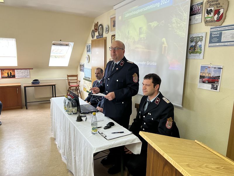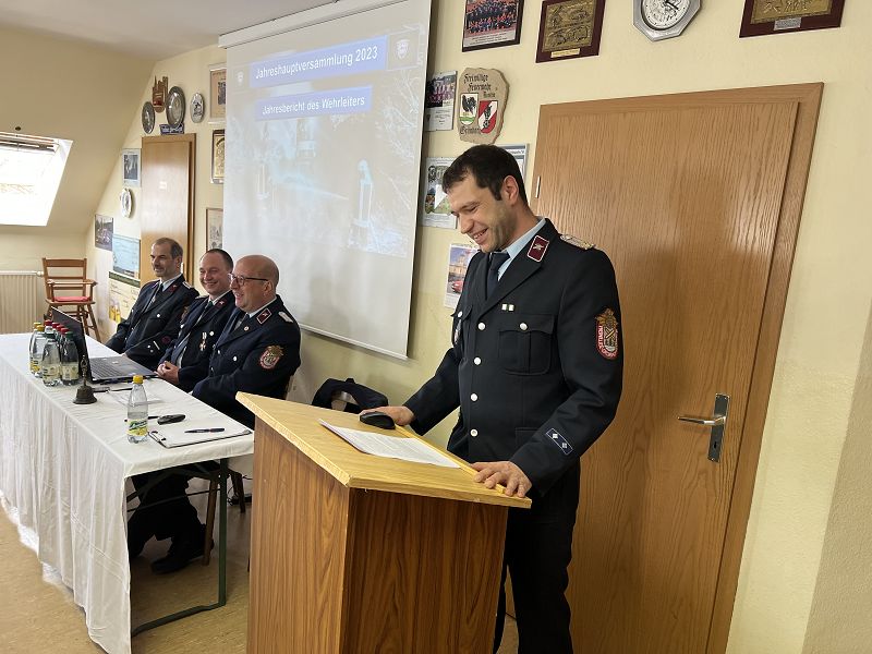 Unter den Augen der Gäste aus Kommunalverwaltung und Kreisfeuerwehrverband bilanziert Gemeindewehrleiter Michael Breitfeld ein interessantes Ausbildungs- und Einsatzjahr. Und dass, obwohl die Corona-Pandemie in den ersten Monaten allen noch sehr zusetzte.
