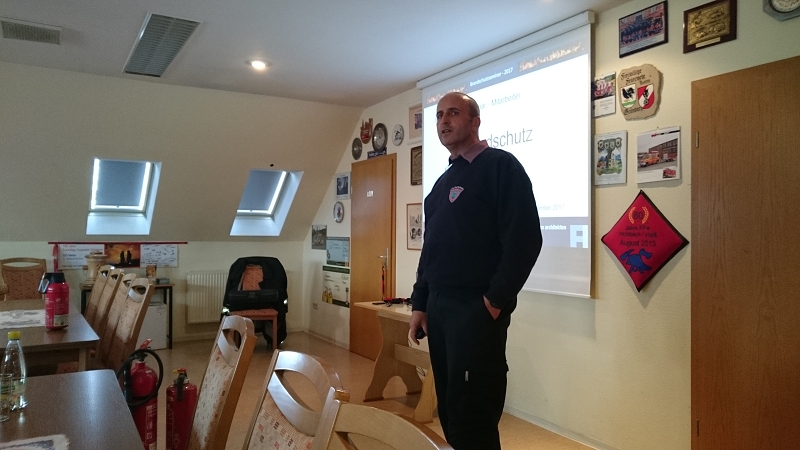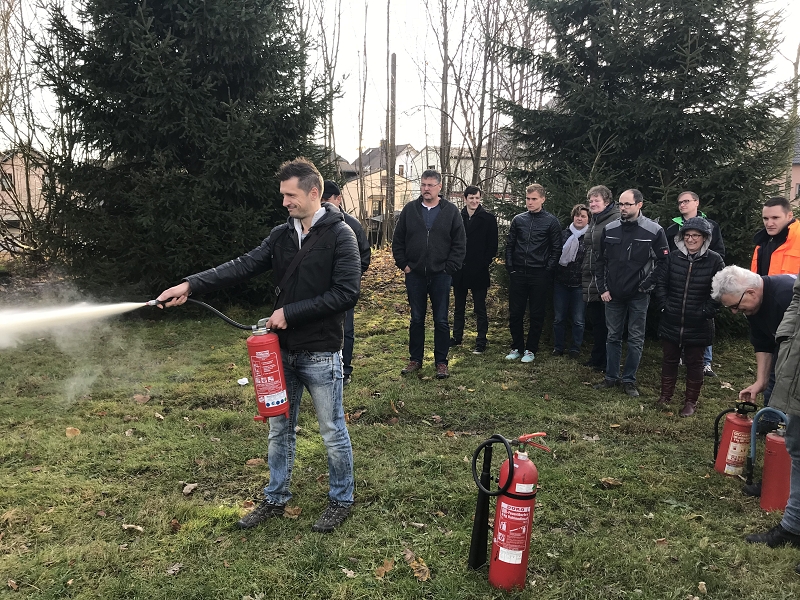Wenn auch sicher den meisten Mitarbeitern geläufig, auch das Absetzen eines Notrufes wurde geschult, ehe Kamerad Körner über die Theorie zu Feuerlöschern referierte. Welche Brandklassen sind für welchen Feuerlöscher geeignet, wie funktioniert überhaupt ein Feuerlöscher. Und was noch viel Wichtiger ist, wann lohnt sich der Einsatz eines Feuerlöschers und wann sollte man gleich die Feuerwehr rufen.