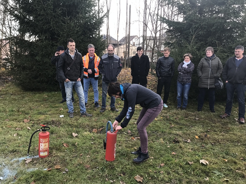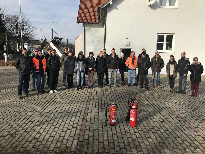 Zunächst wurden die Mitarbeiter im Brandschutz des eigenen Büros geschult. Was zählt zu den Gefahrenquellen? Wo kann man auf die Feuerlöscher zugreifen? Wie funktioniert die hauseigene Brandmeldeanlage? Auch wenn sich alle wünschen, niemals einen Brand im Büro erleben zu müssen, ist es doch angebracht zu wissen, wie man sich bei einem Brand im Bürogebäude verhalten sollte und wo sich alle außerhalb des Büros sammeln können.