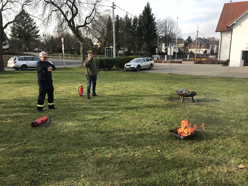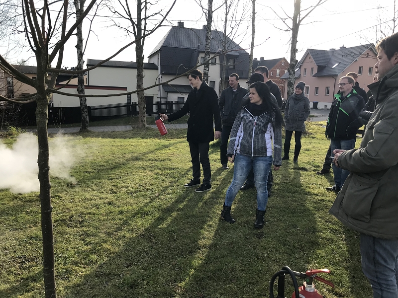 Gestärkt mit einer geballten Ladung an Wissen ging es dann im Außengelände zur Sache. Geübt wurde mit Trainingsfeuerlöschern und dabei wurde auch immer erläutert wie wenig Zeit man doch bis zum geleerten Löscher hat.
