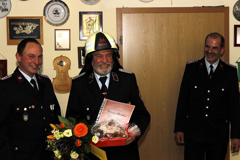 Werner Günther durfte auch seinen ausgemusterten Einsatzhelm in den Feuerwehrruhestand mitnehmen. Die Kameraden verliehen ihm den Helm mit der Sonderbeschriftung S4, was im Stabsdienst der Feuerwehr die Bedeutung für die Versorgungsabteilung hat. Eine zutreffende Funktion für den Mann, der sich in all seinem Feuerwehrleben auch um alles gekümmert hat.