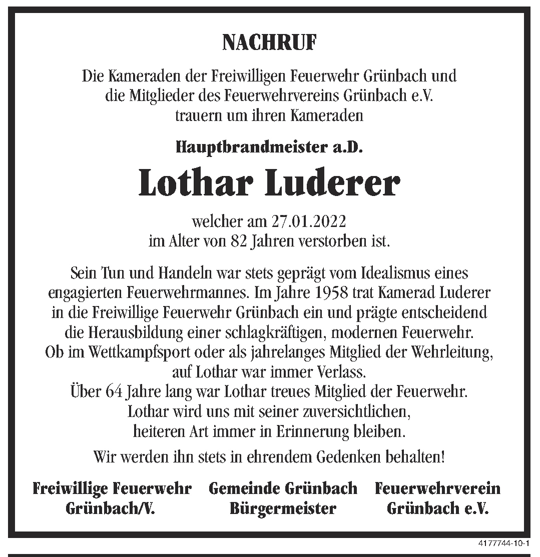 Lothar Luderer war es auch, der im Jahr 2001 mit Weitsicht sein Amt in der Wehrleitung an Klaus Körner übergab. In ihm fand er einen zuverlässigen Gerätewartnachfolger. Seine Meinung war bis zu seinem Tod immer sehr gefragt. Einen Ausbildungsdienst, den er aus dringenden Gründen nicht wahrnehmen konnte, zählte für unseren Lothar zur Höchststrafe.